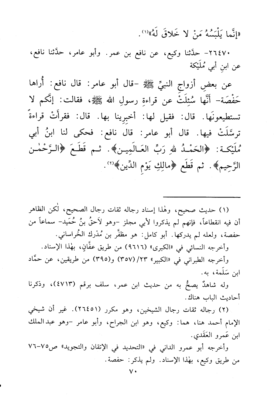 ٢٦٤٧٠ - حَدَّثَنَا وَكِيعٌ، عَنْ نَافِعِ بْنِ عُمَرَ، وَأَبُو عَامِرٍ، حَدَّثَنَا نَافِعٌ، عَنِ ابْنِ أَبِي مُلَيْكَةَ، عَنْ بَعْضِ أَزْوَاجِ النَّبِيِّ صَلَّى اللهُ عَلَيْهِ وَسَلَّمَ قَالَ: أَبُو عَامِرٍ، قَالَ نَافِعٌ: أُرَاهَا حَفْصَةَ أَنَّهَا سُئِلَتْ عَنْ قِرَاءَةِ رَسُولِ اللهِ صَلَّى اللهُ عَلَيْهِ وَسَلَّمَ فَقَالَتْ: إِنَّكُمْ لَا تَسْتَطِيعُونَهَا قَالَ: فَقِيلَ لَهَا أَخْبِرِينَا بِهَا قَالَ: فَقَرَأَتْ قِرَاءَةً تَرَسَّلَتْ فِيهَا قَالَ أَبُو عَامِرٍ:، قَالَ نَافِعٌ: فَحَكَى لَنَا ابْنُ أَبِي مُلَيْكَةَ {الْحَمْدُ لِلَّهِ رَبِّ الْعَالَمِينَ} [الفاتحة: ٢] . ثُمَّ قَطَّعَ {الرَّحْمَنِ الرَّحِيمِ} [الفاتحة: ١] ثُمَّ قَطَّعَ {مَالِكِ يَوْمِ الدِّينِ} (٢)