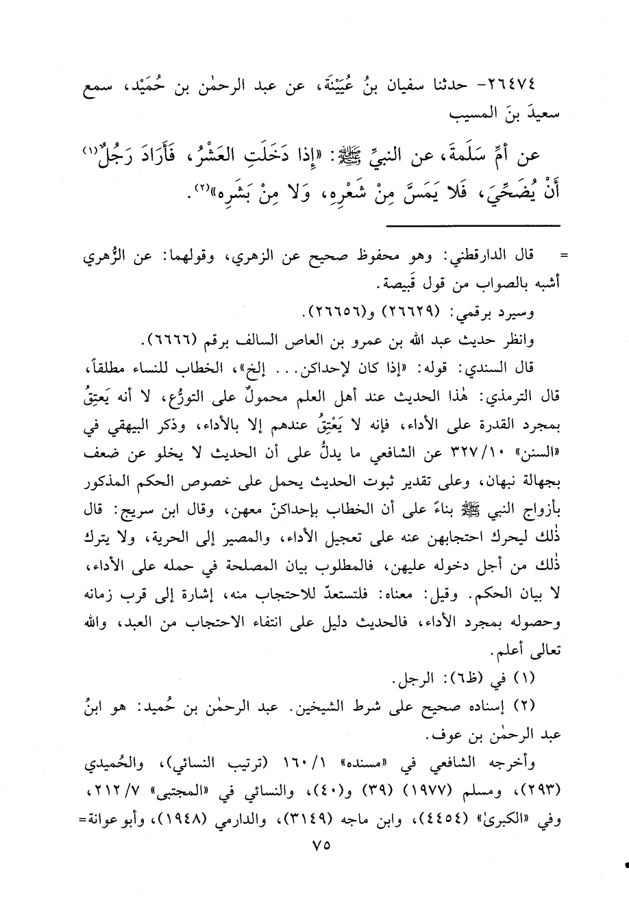 ٢٦٤٧٤ - حَدَّثَنَا سُفْيَانُ بْنُ عُيَيْنَةَ، عَنْ عَبْدِ الرَّحْمَنِ بْنِ حُمَيْدٍ، سَمِعَ سَعِيدَ بْنَ الْمُسَيِّبِ، عَنْ أُمِّ سَلَمَةَ، عَنِ النَّبِيِّ صَلَّى اللهُ عَلَيْهِ وَسَلَّمَ " إِذَا دَخَلَتِ الْعَشْرُ، فَأَرَادَ رَجُلٌ (١) أَنْ يُضَحِّيَ، فَلَا يَمَسَّ مِنْ شَعْرِهِ، وَلَا مِنْ بَشَرِهِ " (٢)
