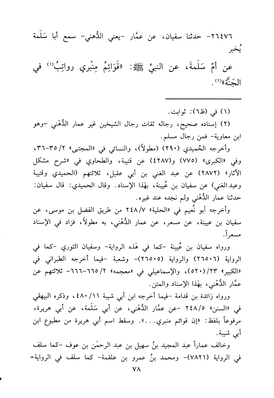 ٢٦٤٧٦ - حَدَّثَنَا سُفْيَانُ، عَنْ عَمَّارٍ يَعْنِي الدُّهْنِيَّ، سَمِعَ أَبَا سَلَمَةَ، يُخْبِرُ عَنْ أُمِّ سَلَمَةَ، عَنِ النَّبِيِّ صَلَّى اللهُ عَلَيْهِ وَسَلَّمَ " قَوَائِمُ مِنْبَرِي رَوَاتِبُ (١) فِي الْجَنَّةِ " (٢)