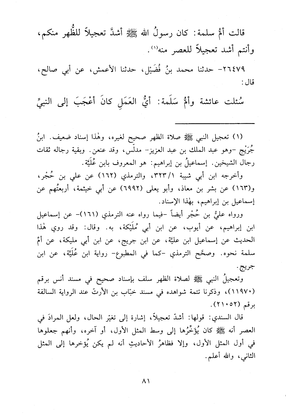 وتعجيلُ النبي صَلَّى اللهُ عَلَيْهِ وَسَلَّمَ لصلاة الظهر سلف بإسناد صحيح في مسند أنس برقم (١١٩٧٠) ، وذكرنا تتمة شواهده في مسند خبّاب بن الأرتّ عند الرواية السالفة برقم (٢١٠٥٢) .