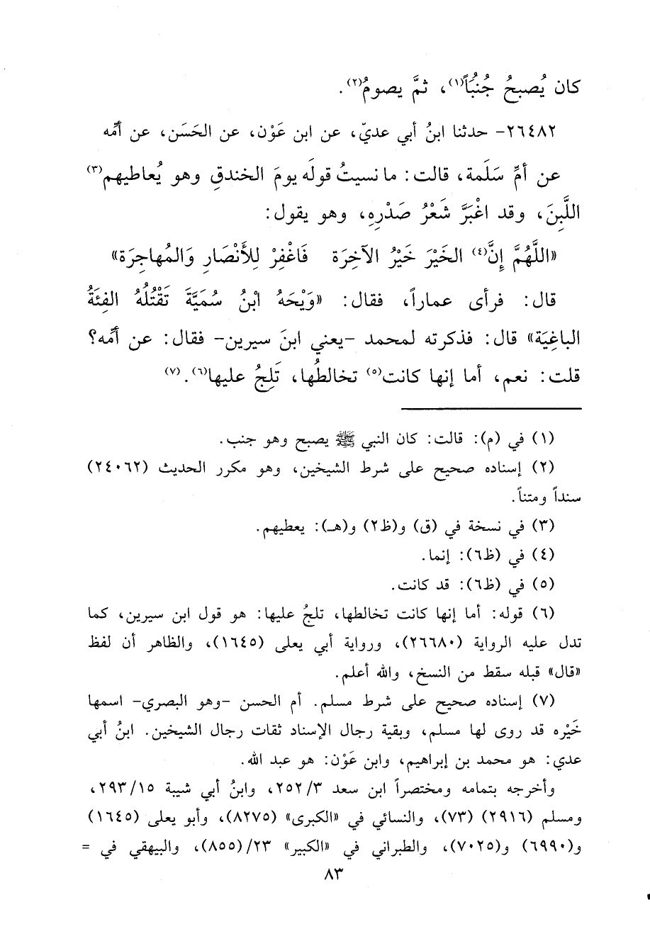 (٧) إسناده صحيح على شرط مسلم. أم الحسن - وهو البصري - اسمها خَيْره قد روى لها مسلم، وبقية رجال الإسناد ثقات رجال الشيخين. ابنُ أبي عدي: هو محمد بن إبراهيم، وابن عَوْن: هو عبد الله.