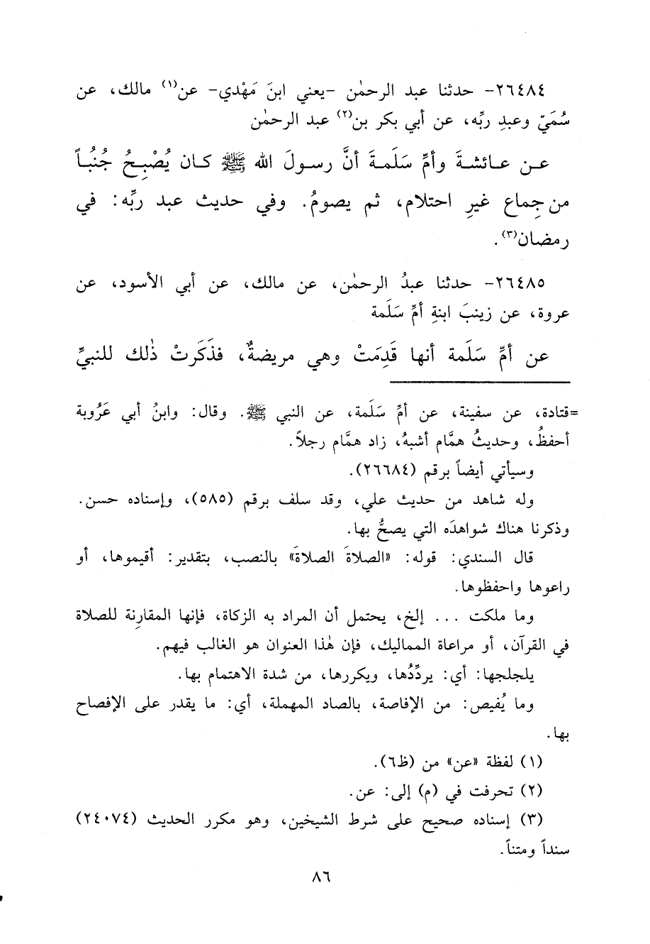 ٢٦٤٨٤ - حَدَّثَنَا عَبْدُ الرَّحْمَنِ يَعْنِي ابْنَ مَهْدِيٍّ، عَنْ (١) مَالِكٍ عَنْ سُمَيٍّ، وَعَبْدِ رَبِّهِ، عَنْ أَبِي بَكْرِ بْنِ (٢) عَبْدِ الرَّحْمَنِ، عَنْ عَائِشَةَ، وَأُمِّ سَلَمَةَ أَنَّ رَسُولَ اللهِ صَلَّى اللهُ عَلَيْهِ وَسَلَّمَ كَانَ يُصْبِحُ جُنُبًا مِنْ جِمَاعٍ غَيْرِ احْتِلَامٍ، ثُمَّ يَصُومُ " وَفِي حَدِيثِ عَبْدِ رَبِّهِ: فِي رَمَضَانَ (٣)