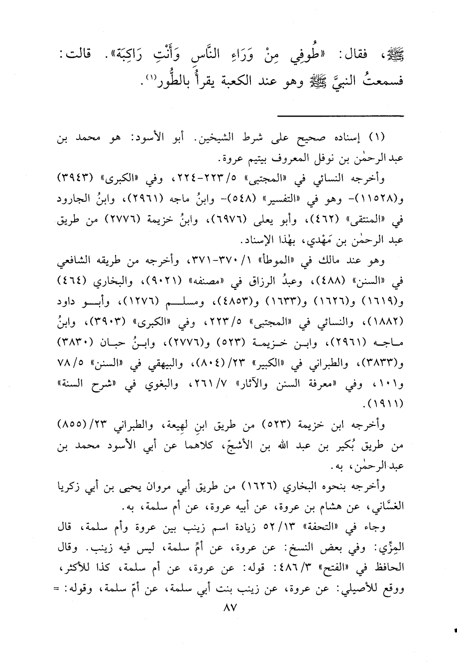 فَقَالَ: " طُوفِي مِنْ وَرَاءِ النَّاسِ وَأَنْتِ رَاكِبَةٌ " قَالَتْ: فَسَمِعْتُ النَّبِيَّ صَلَّى اللهُ عَلَيْهِ وَسَلَّمَ وَهُوَ عِنْدَ الْكَعْبَةِ يَقْرَأُ بِالطُّورِ (١)