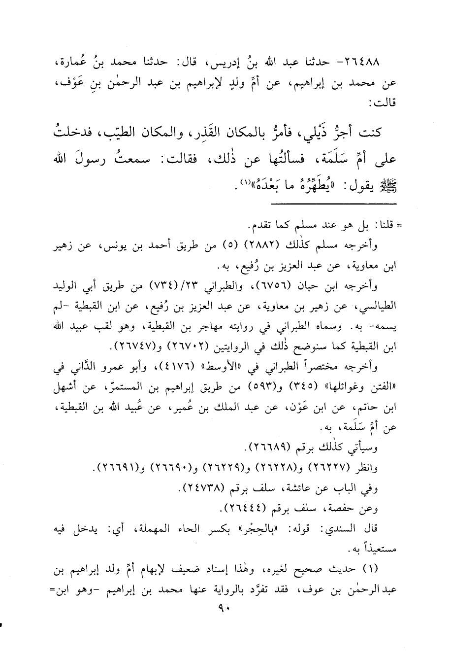 ٢٦٤٨٨ - حَدَّثَنَا عَبْدُ اللهِ بْنُ إِدْرِيسَ، قَالَ: حَدَّثَنَا مُحَمَّدُ بْنُ عُمَارَةَ، عَنْ مُحَمَّدِ بْنِ إِبْرَاهِيمَ، عَنْ أُمِّ وَلَدٍ لِإِبْرَاهِيمَ بْنِ عَبْدِ الرَّحْمَنِ بْنِ عَوْفٍ، قَالَتْ: كُنْتُ أَجُرُّ ذَيْلِي، فَأَمُرُّ بِالْمَكَانِ الْقَذِرِ، وَالْمَكَانِ الطَّيِّبِ، فَدَخَلْتُ عَلَى أُمِّ سَلَمَةَ فَسَأَلْتُهَا عَنْ ذَلِكَ، فَقَالَتْ: سَمِعْتُ رَسُولَ اللهِ صَلَّى اللهُ عَلَيْهِ وَسَلَّمَ يَقُولُ " يُطَهِّرُهُ مَا بَعْدَهُ " (١)