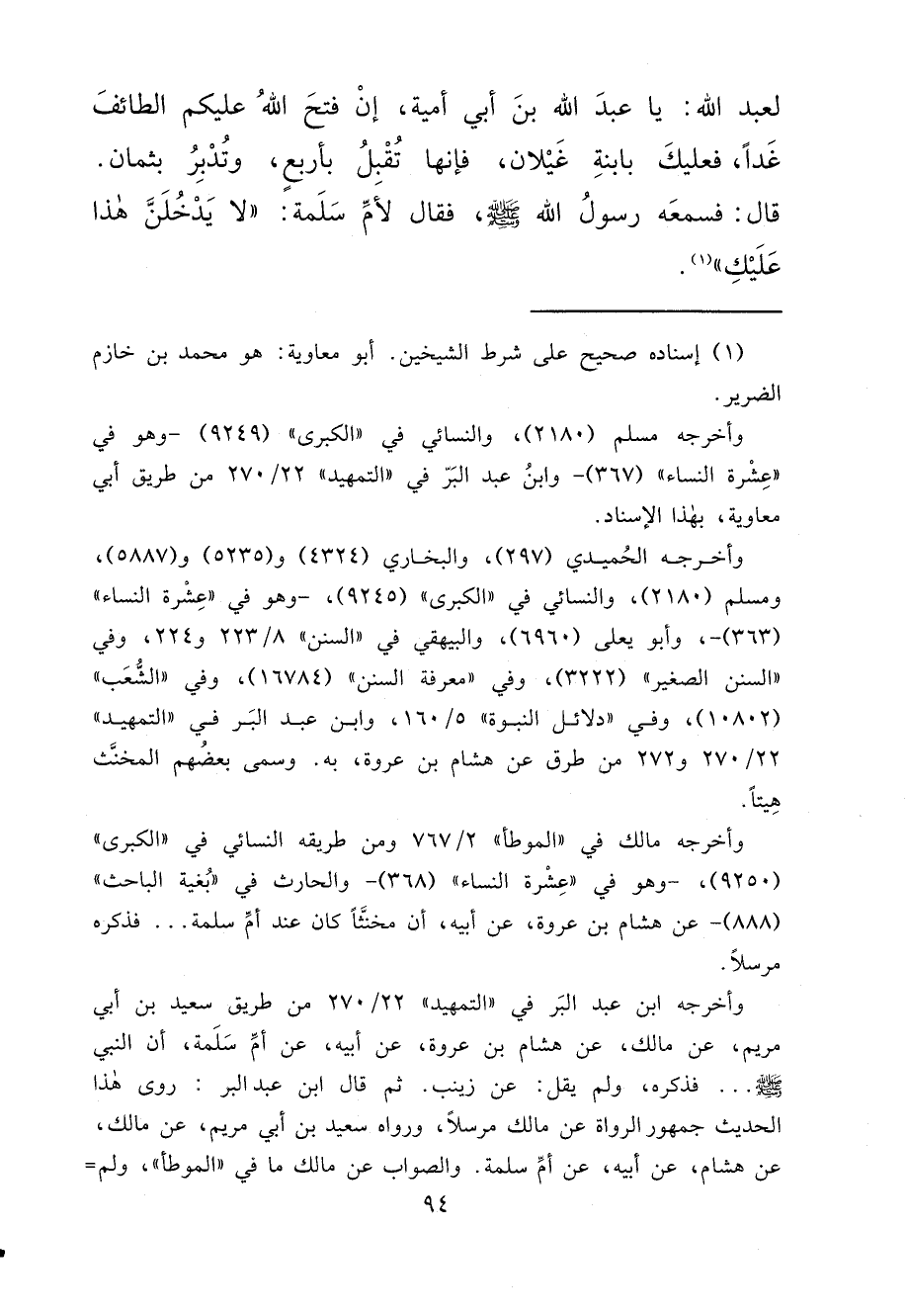لِعَبْدِ اللهِ: يَا عَبْدَ اللهِ بْنَ أَبِي أُمَيَّةَ، إِنْ فَتَحَ اللهُ عَلَيْكُمُ الطَّائِفَ غَدًا، فَعَلَيْكَ بِابْنَةِ غَيْلَانَ، فَإِنَّهَا تُقْبِلُ بِأَرْبَعٍ، وَتُدْبِرُ بِثَمَانٍ، قَالَ: فَسَمِعَهُ رَسُولُ اللهِ صَلَّى اللهُ عَلَيْهِ وَسَلَّمَ فَقَالَ لِأُمِّ سَلَمَةَ: " لَا يَدْخُلَنَّ هَذَا عَلَيْكِ " (١)