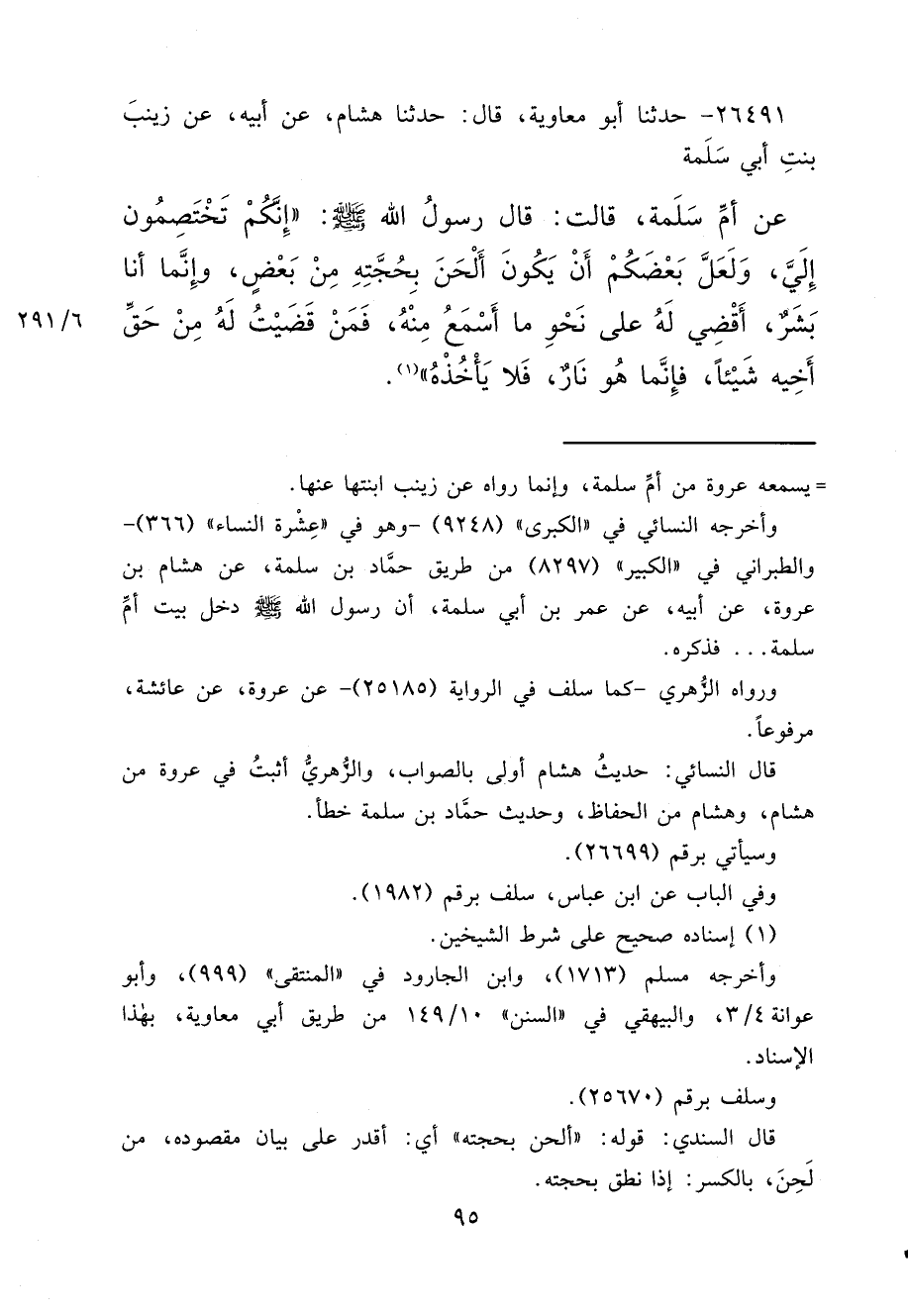 ٢٦٤٩١ - حَدَّثَنَا أَبُو مُعَاوِيَةَ، قَالَ: حَدَّثَنَا هِشَامٌ، عَنْ أَبِيهِ، عَنْ زَيْنَبَ بِنْتِ أَبِي سَلَمَةَ، عَنْ أُمِّ سَلَمَةَ، قَالَتْ: قَالَ رَسُولُ اللهِ صَلَّى اللهُ عَلَيْهِ وَسَلَّمَ: " إِنَّكُمْ تَخْتَصِمُونَ إِلَيَّ، وَلَعَلَّ بَعْضَكُمْ أَنْ يَكُونَ أَلْحَنَ بِحُجَّتِهِ مِنْ بَعْضٍ، وَإِنَّمَا أَنَا بَشَرٌ أَقْضِي لَهُ عَلَى نَحْوِ مَا أَسْمَعُ مِنْهُ، فَمَنْ قَضَيْتُ لَهُ مِنْ حَقِّ أَخِيهِ شَيْئًا، فَإِنَّمَا هُوَ نَارٌ فَلَا يَأْخُذْهُ " (١)