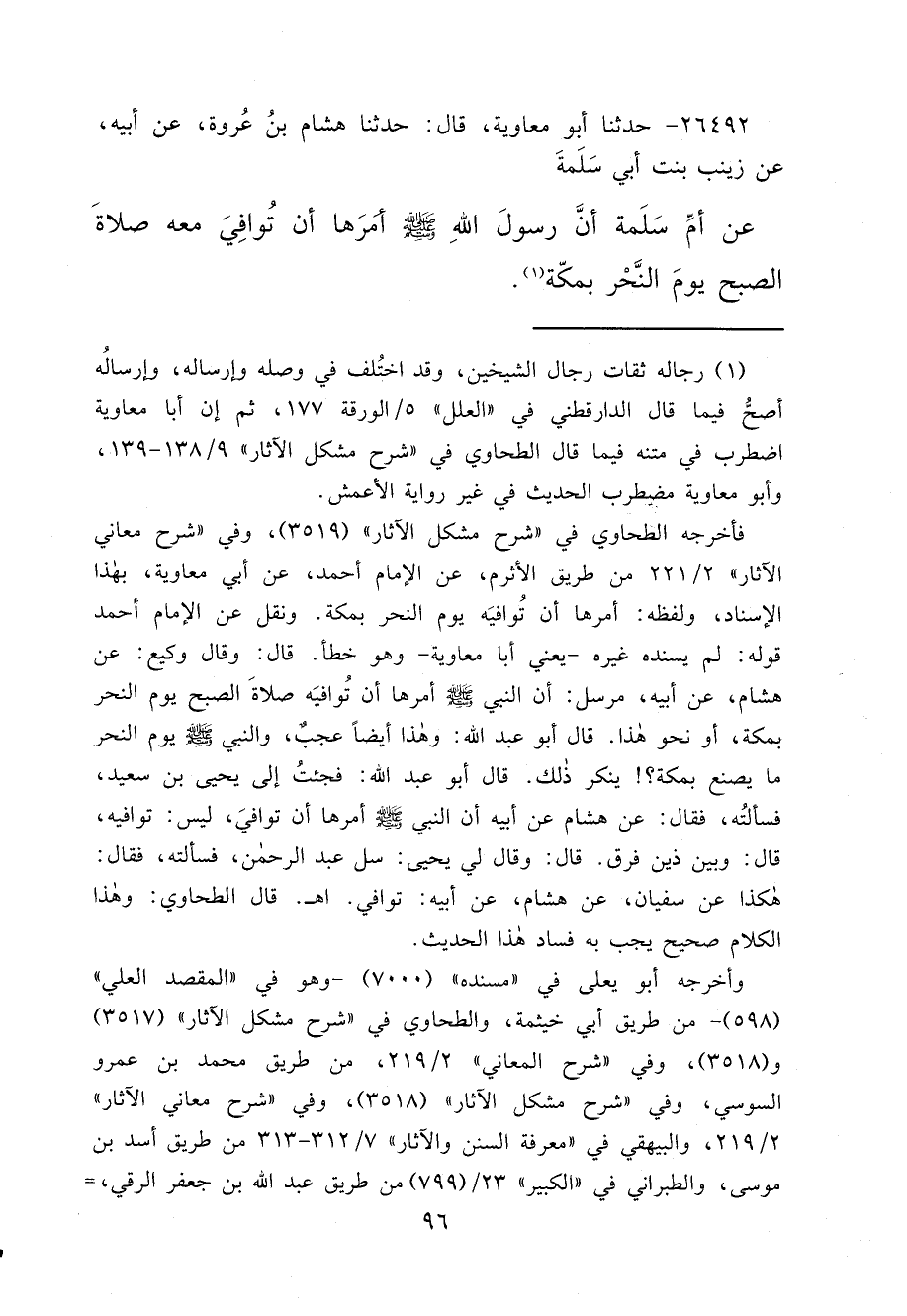 ٢٦٤٩٢ - حَدَّثَنَا أَبُو مُعَاوِيَةَ، قَالَ: حَدَّثَنَا هِشَامُ بْنُ عُرْوَةَ، عَنْ أَبِيهِ، عَنْ زَيْنَبَ بِنْتِ أَبِي سَلَمَةَ، عَنْ أُمِّ سَلَمَةَ، " أَنَّ رَسُولَ اللهِ صَلَّى اللهُ عَلَيْهِ وَسَلَّمَ أَمَرَهَا أَنْ تُوَافِيَ مَعَهُ صَلَاةَ الصُّبْحِ يَوْمَ النَّحْرِ بِمَكَّةَ " (١)