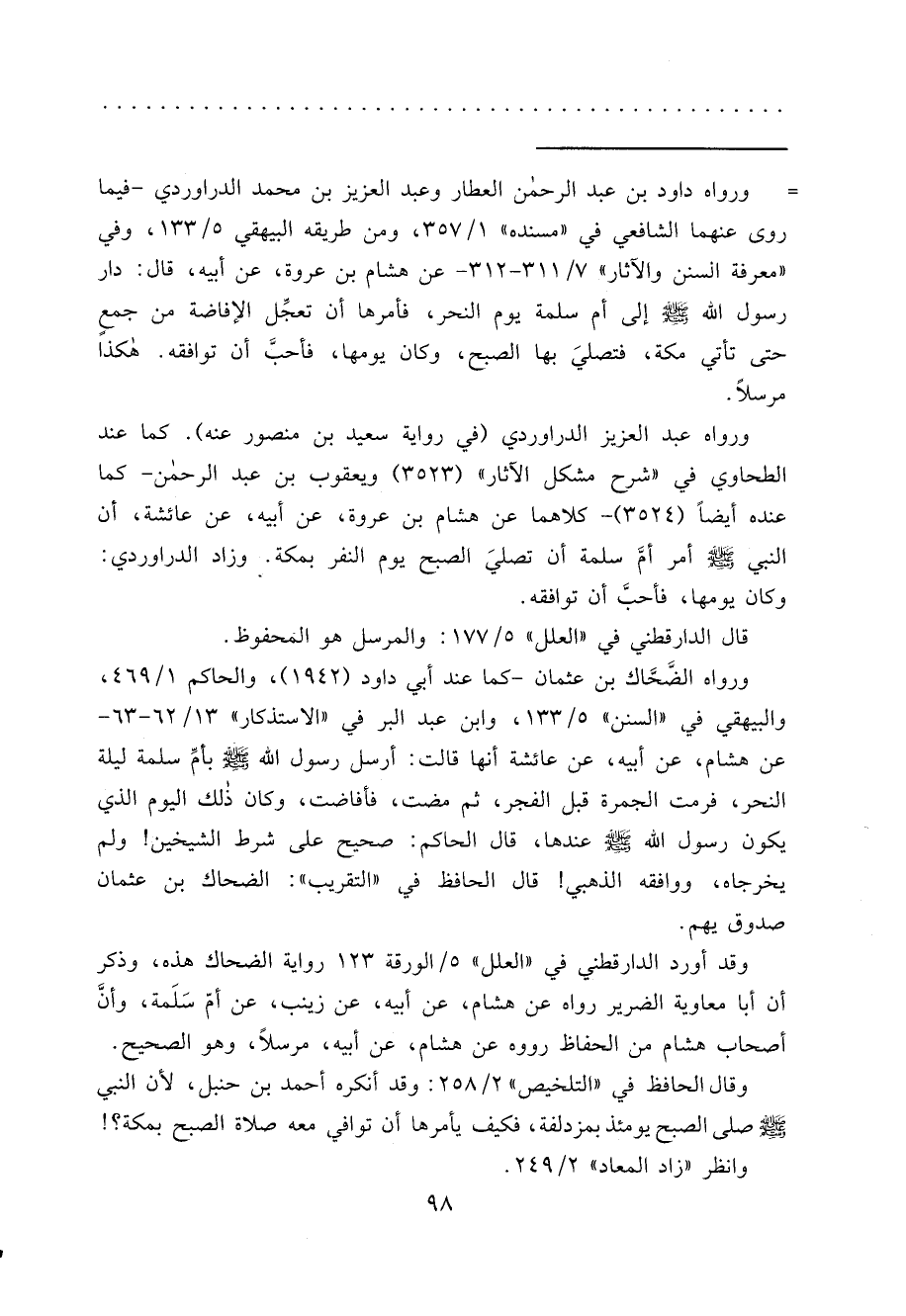 ورواه عبد العزيز الدراوردي (في رواية سعيد بن منصور عنه) . كما عند الطحاوي في "شرح مشكل الآثار" (٣٥٢٣) ويعقوب بن عبد الرحمن - كما عنده أيضاً (٣٥٢٤) - كلاهما عن هشام بن عروة، عن أبيه، عن عائشة، أن النبي صَلَّى اللهُ عَلَيْهِ وَسَلَّمَ أمر أمَّ سلمة أن تصليَ الصبح يوم النفر بمكة. وزاد الدراوردي: وكان يومها، فأحبَّ أن توافقه.