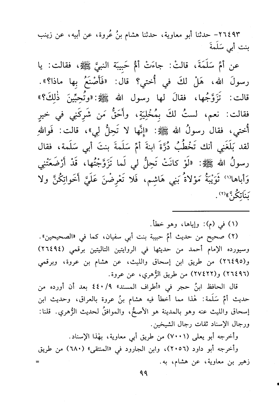 ٢٦٤٩٣ - حَدَّثَنَا أَبُو مُعَاوِيَةَ، حَدَّثَنَا هِشَامُ بْنُ عُرْوَةَ، عَنْ أَبِيهِ، عَنْ زَيْنَبَ بِنْتِ أَبِي سَلَمَةَ، عَنْ أُمِّ سَلَمَةَ، قَالَتْ: جَاءَتْ أُمُّ حَبِيبَةَ النَّبِيَّ صَلَّى اللهُ عَلَيْهِ وَسَلَّمَ، فَقَالَتْ: يَا رَسُولَ اللهِ، هَلْ لَكَ فِي أُخْتِي؟ قَالَ: " فَأَصْنَعُ بِهَا مَاذَا؟ " قَالَتْ: تَزَوَّجُهَا، فَقَالَ لَهَا رَسُولُ اللهِ صَلَّى اللهُ عَلَيْهِ وَسَلَّمَ: " وَتُحِبِّينَ ذَلِكَ؟ " فَقَالَتْ: نَعَمْ، لَسْتُ لَكَ بِمُخْلِيَةٍ، وَأَحَقُّ مَنْ شَرِكَنِي فِي خَيْرٍ أُخْتِي، فَقَالَ رَسُولُ اللهِ صَلَّى اللهُ عَلَيْهِ وَسَلَّمَ: " إِنَّهَا لَا تَحِلُّ لِي "، قَالَتْ: فَوَاللهِ لَقَدْ بَلَغَنِي أَنَّكَ تَخْطُبُ دُرَّةَ ابْنَةَ أُمِّ سَلَمَةَ بِنْتَ أَبِي سَلَمَةَ، فَقَالَ رَسُولُ اللهِ صَلَّى اللهُ عَلَيْهِ وَسَلَّمَ: " لَوْ كَانَتْ تَحِلُّ لِي لَمَا تَزَوَّجْتُهَا، قَدْ أَرْضَعَتْنِي وَأَبَاهَا (١) ثُوَيْبَةُ مَوْلَاةُ بَنِي هَاشِمٍ، فَلَا تَعْرِضْنَ عَلَيَّ أَخَوَاتِكُنَّ وَلَا بَنَاتِكُنَّ " (٢)