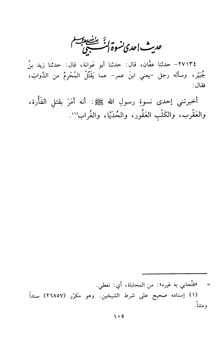 ٢٧١٣٤ - حَدَّثَنَا عَفَّانُ، قَالَ: حَدَّثَنَا أَبُو عَوَانَةَ، قَالَ: حَدَّثَنَا زَيْدُ بْنُ جُبَيْرٍ، وَسَأَلَهُ رَجُلٌ يَعْنِي ابْنَ عُمَرَ، عَمَّا يَقْتُلُ الْمُحْرِمُ مِنَ الدَّوَابِّ؟ فَقَالَ: أَخْبَرَتْنِي إِحْدَى نِسْوَةِ رَسُولِ اللهِ صَلَّى اللهُ عَلَيْهِ وَسَلَّمَ، أَنَّهُ " أَمَرَ بِقَتْلِ الْفَأْرَةِ، وَالْعَقْرَبِ، وَالْكَلْبِ الْعَقُورِ، وَالْحُدَيَّا، وَالْغُرَابِ " (١)