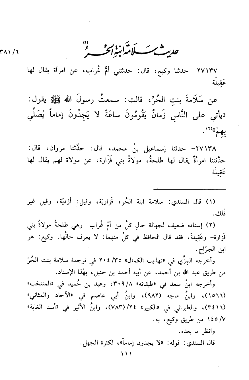 ٢٧١٣٧ - حَدَّثَنَا وَكِيعٌ، قَالَ: حَدَّثَتْنِي أُمُّ غُرَابٍ، عَنِ امْرَأَةٍ يُقَالُ لَهَا: عَقِيلَةُ، عَنْ سَلَامَةَ بْنَتِ الْحُرِّ قَالَتْ: سَمِعْتُ رَسُولَ اللهِ صَلَّى اللهُ عَلَيْهِ وَسَلَّمَ يَقُولُ: " يَأْتِي عَلَى النَّاسِ زَمَانٌ يَقُومُونَ سَاعَةً لَا يَجِدُونَ إِمَامًا يُصَلِّي بِهِمْ " (٢)