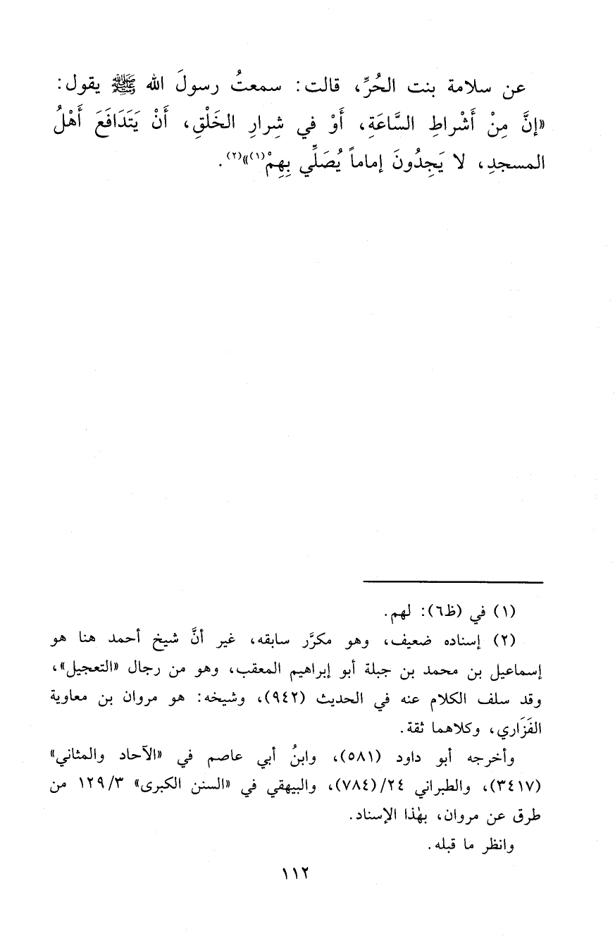 عَنْ سَلَامَةَ بْنَتِ الْحُرِّ قَالَتْ: سَمِعْتُ رَسُولَ اللهِ صَلَّى اللهُ عَلَيْهِ وَسَلَّمَ يَقُولُ: " إِنَّ مِنْ أَشْرَاطِ السَّاعَةِ، أَوْ فِي شِرَارِ الْخَلْقِ، أَنْ يَتَدَافَعَ أَهْلُ الْمَسْجِدِ لَا يَجِدُونَ إِمَامًا يُصَلِّي بِهِمْ (١) " (٢)