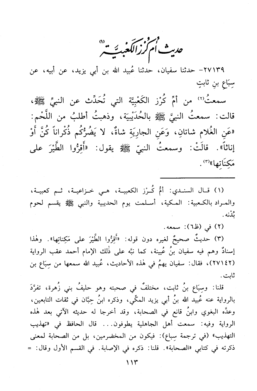 ٢٧١٣٩ - حَدَّثَنَا سُفْيَانُ، حَدَّثَنَا عُبَيْدُ اللهِ بْنُ أَبِي يَزِيدَ، عَنْ أَبِيهِ، عَنْ سِبَاعِ بْنِ ثَابِتٍ، سَمِعْتُ (٢) مِنْ أُمِّ كُرْزٍ الْكَعْبِيَّةِ الَّتِي تُحَدِّثُ عَنِ النَّبِيِّ صَلَّى اللهُ عَلَيْهِ وَسَلَّمَ قَالَتْ: سَمِعْتُ النَّبِيَّ صَلَّى اللهُ عَلَيْهِ وَسَلَّمَ بِالْحُدَيْبِيَةِ وَذَهَبْتُ أَطْلُبُ مِنَ اللَّحْمِ: " عَنِ الْغُلَامِ شَاتَانِ، وَعَنِ الْجَارِيَةِ شَاةٌ، لَا يَضُرُّكُمْ ذُكْرَانًا كُنَّ أَوْ إِنَاثًا "، قَالَتْ: وَسَمِعْتُ النَّبِيَّ صَلَّى اللهُ عَلَيْهِ وَسَلَّمَ يَقُولُ: " أَقِرُّوا الطَّيْرَ عَلَى مَكِنَاتِهَا " (٣)
