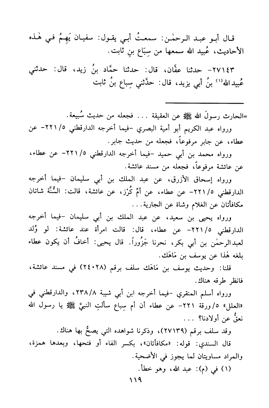 ورواه أسلم المنقري - فيما أخرجه ابن أبي شيبة ٨/٢٣٨، والدارقطني في "العلل" ٥/ورقة ٢٢١- عن عطاء أن أم سِباع سألتِ النبيَّ صَلَّى اللهُ عَلَيْهِ وَسَلَّمَ يا رسول الله نعقُّ عن أولادنا؟ ...