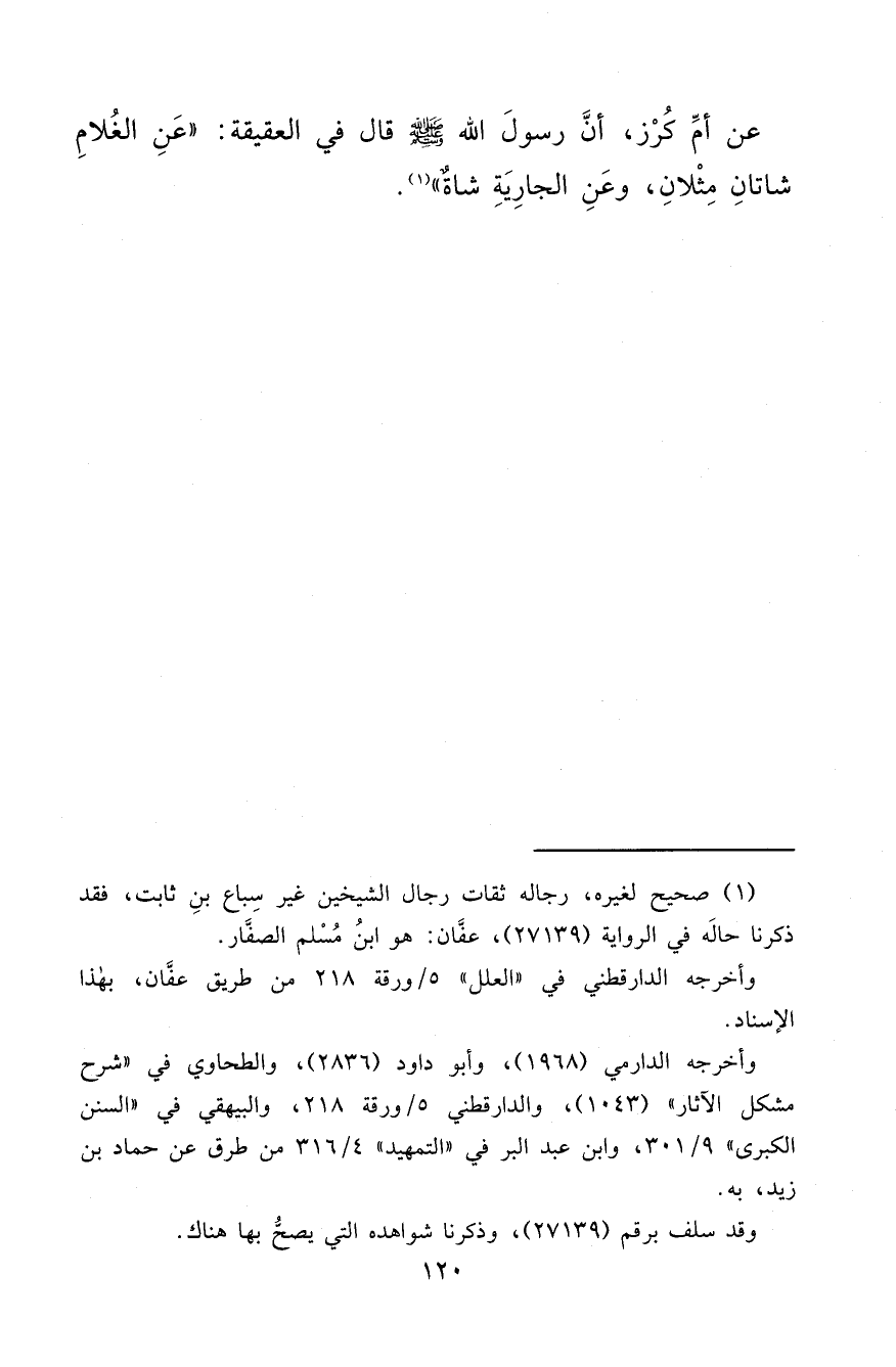 عَنْ أُمِّ كُرْزٍ، أَنَّ رَسُولَ اللهِ صَلَّى اللهُ عَلَيْهِ وَسَلَّمَ قَالَ فِي الْعَقِيقَةِ: " عَنِ الْغُلَامِ شَاتَانِ مِثْلَانِ، وَعَنِ الْجَارِيَةِ شَاةٌ " (١)