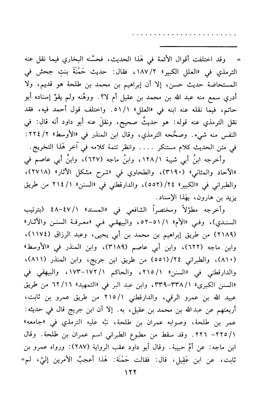 = وقد اختلفت أقوال الأئمة في هذا الحديث، فحسَّنه البخاري فيما نقل عنه الترمذي في "العلل الكبير" ٢/١٨٧، فقال: حديث حَمْنَةَ بنتِ جحش في المستحاضة حديث حسن، إلا أن إبراهيم بن محمد بن طلحه هو قديم، ولا أدري سمع منه عبد الله بن محمد بن عقيل أم لا؟. ووهَّنه ولم يقوِّ إسناده أبو
