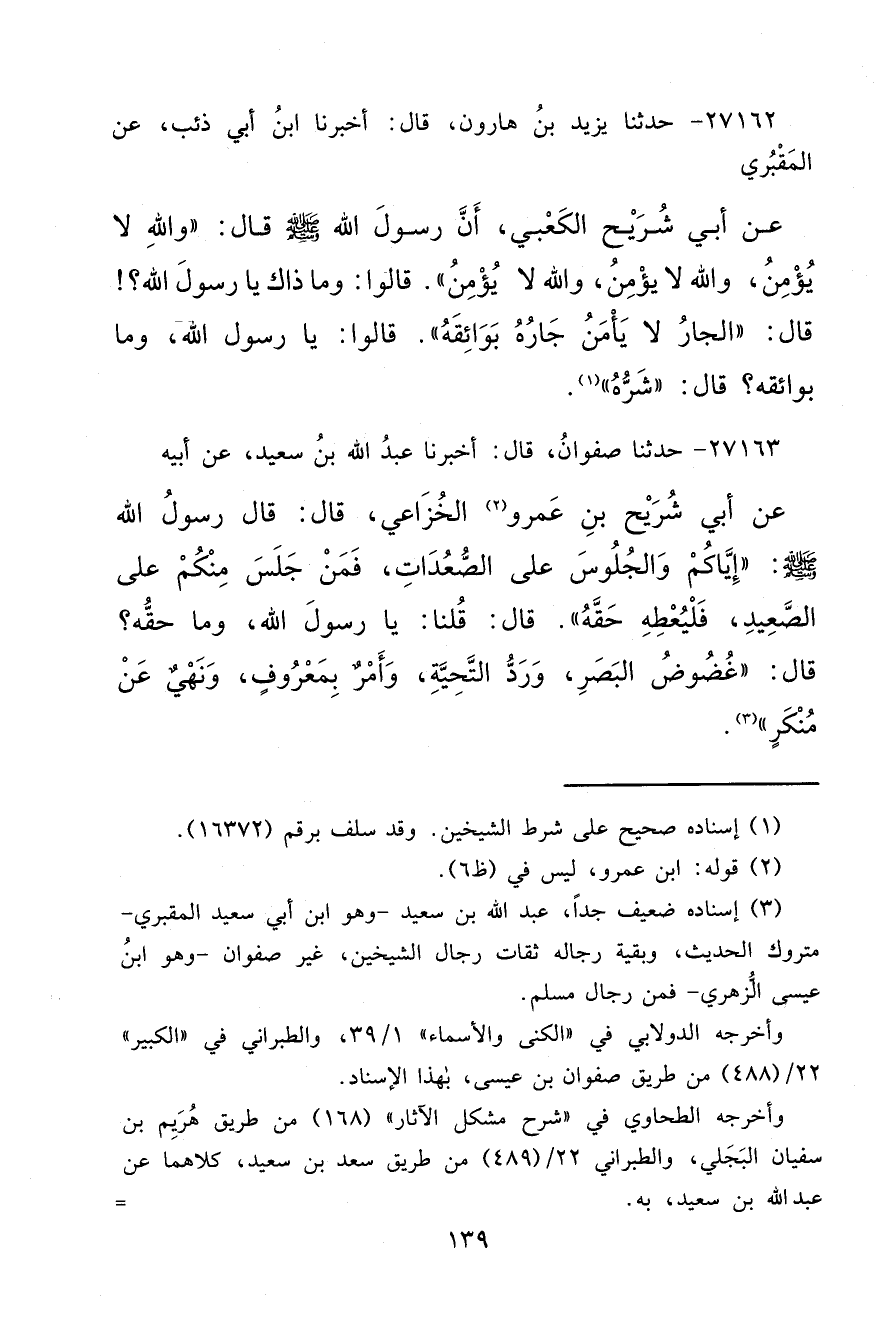 ٢٧١٦٢ - حَدَّثَنَا يَزِيدُ بْنُ هَارُونَ، قَالَ: أَخْبَرَنَا ابْنُ أَبِي ذِئْبٍ، عَنِ الْمَقْبُرِيِّ، عَنْ أَبِي شُرَيْحٍ الْكَعْبِيِّ، أَنَّ رَسُولَ اللهِ صَلَّى اللهُ عَلَيْهِ وَسَلَّمَ قَالَ: " وَاللهِ لَا يُؤْمِنُ، وَاللهِ لَا يُؤْمِنُ، وَاللهِ لَا يُؤْمِنُ "، قَالُوا: وَمَا ذَاكَ يَا رَسُولَ اللهِ؟ قَالَ: " الْجَارُ لَا يَأْمَنُ جَارُهُ بَوَائِقَهُ "، قَالُوا: يَا رَسُولَ اللهِ، وَمَا بَوَائِقُهُ؟ قَالَ: " شَرُّهُ " (١)