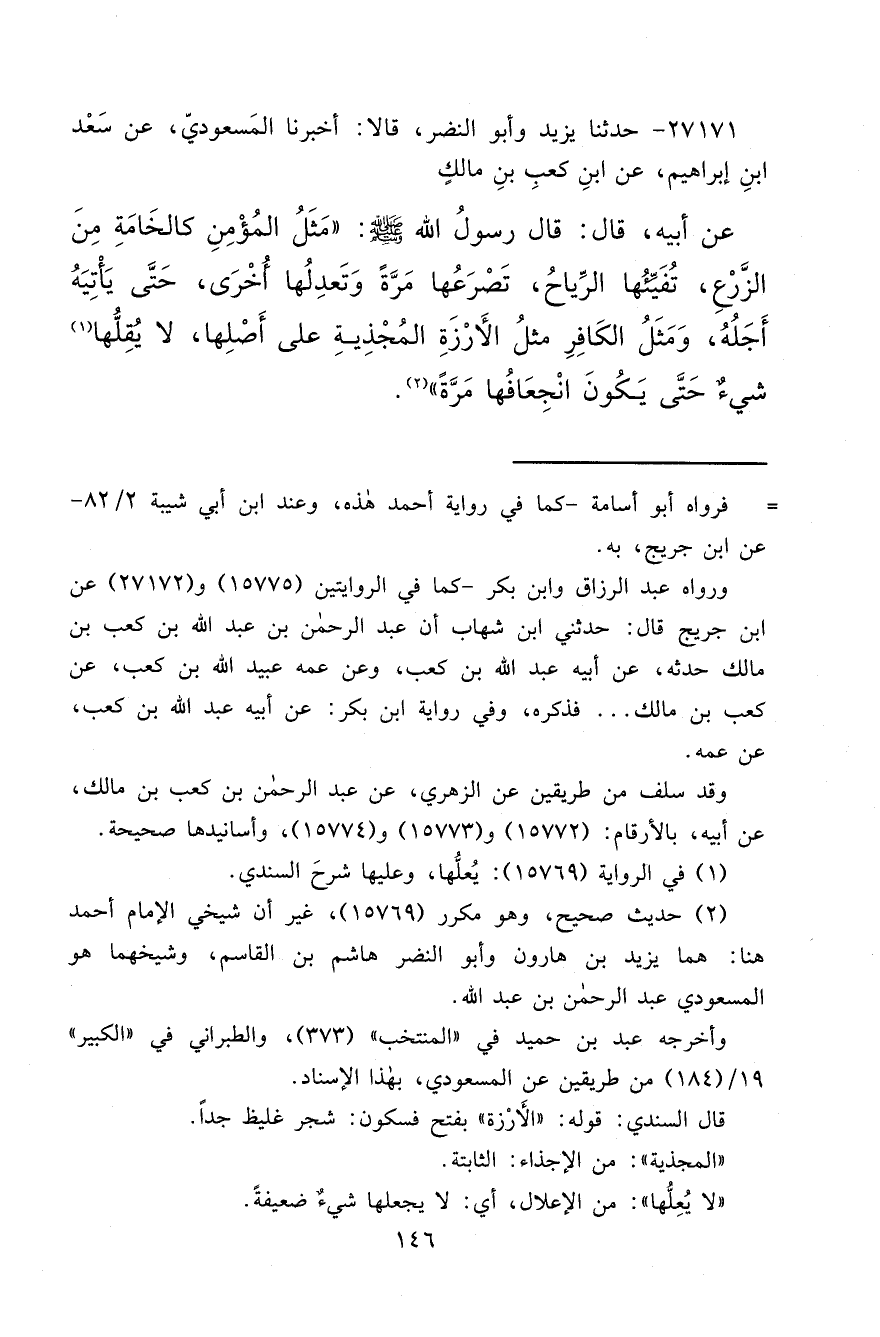 ٢٧١٧١ - حَدَّثَنَا يَزِيدُ، وَأَبُو النَّضْرِ، قَالَا: أَنَا الْمَسْعُودِيُّ، عَنْ سَعْدِ بْنِ إِبْرَاهِيمَ، عَنِ ابْنِ كَعْبِ بْنِ مَالِكٍ، عَنْ أَبِيهِ قَالَ: قَالَ رَسُولُ اللهِ صَلَّى اللهُ عَلَيْهِ وَسَلَّمَ: " مَثَلُ الْمُؤْمِنِ كَالْخَامَةِ مِنَ الزَّرْعِ تُفَيِّئُهَا الرِّيَاحُ، تَصْرَعُهَا مَرَّةً وَتَعْدِلُهَا أُخْرَى حَتَّى يَأْتِيَهُ أَجَلُهُ، وَمَثَلُ الْكَافِرِ مَثَلُ الْأَرْزَةِ الْمُجْذِيَةِ عَلَى أَصْلِهَا لَا يُقِلُّهَا (١) شَيْءٌ، حَتَّى يَكُونَ انْجِعَافُهَا مَرَّةً " (٢)