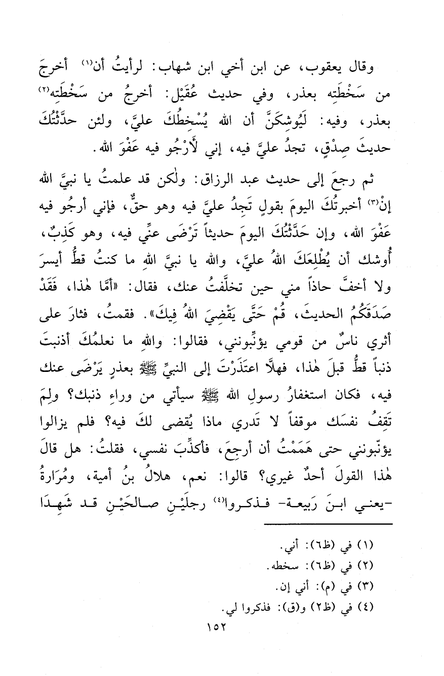 وَقَالَ يَعْقُوبُ: عَنِ ابْنِ أَخِي ابْنِ شِهَابٍ: لَرَأَيْتُ أَنْ (١) أَخْرُجَ مِنْ سَخْطَتِهِ بِعُذْرٍ، وَفِي حَدِيثِ عُقَيْلٍ: أَخْرُجُ مِنْ سَخْطَتِهِ (٢) بِعُذْرٍ، وَفِيهِ: لَيُوشِكَنَّ أَنَّ اللهَ يُسْخِطُكَ عَلَيَّ، وَلَئِنْ حَدَّثْتُكَ حَدِيثَ صِدْقٍ، تَجِدُ عَلَيَّ فِيهِ، إِنِّي لَأَرْجُو فِيهِ عَفْوَ اللهِ، ثُمَّ رَجَعَ إِلَى حَدِيثِ عَبْدِ الرَّزَّاقِ:، وَلَكِنْ قَدْ عَلِمْتُ يَا نَبِيَّ اللهِ أَنِّي إِنْ (٣) أَخْبَرْتُكَ الْيَوْمَ بِقَوْلٍ تَجِدُ عَلَيَّ فِيهِ، وَهُوَ حَقٌّ، فَإِنِّي أَرْجُو فِيهِ عَفْوَ اللهِ، وَإِنْ حَدَّثْتُكَ الْيَوْمَ حَدِيثًا تَرْضَى عَنِّي فِيهِ، وَهُوَ كَذِبٌ، أُوشِكُ أَنْ يُطْلِعَكَ اللهُ عَلَيَّ، وَاللهِ يَا نَبِيَّ اللهِ مَا كُنْتُ قَطُّ أَيْسَرَ، وَلَا أَخَفَّ حَاذًا مِنِّي حِينَ تَخَلَّفْتُ عَنْكَ، فَقَالَ: " أَمَّا هَذَا، فَقَدْ صَدَقَكُمُ الْحَدِيثَ، قُمْ حَتَّى يَقْضِيَ اللهُ فِيكَ " فَقُمْتُ، فَثَارَ عَلَى أَثَرِي نَاسٌ مِنْ قَوْمِي يُؤَنِّبُونَنِي، فَقَالُوا: وَاللهِ مَا نَعْلَمُكَ أَذْنَبْتَ ذَنْبًا قَطُّ قَبْلَ هَذَا، فَهَلَّا اعْتَذَرْتَ إِلَى النَّبِيِّ صَلَّى اللهُ عَلَيْهِ وَسَلَّمَ بِعُذْرٍ يَرْضَى عَنْكَ فِيهِ، فَكَانَ اسْتِغْفَارُ رَسُولِ اللهِ صَلَّى اللهُ عَلَيْهِ وَسَلَّمَ، سَيَأْتِي مِنْ وَرَاءِ ذَنْبِكَ؟ وَلَمْ تُقِفْ نَفْسَكَ مَوْقِفًا لَا تَدْرِي مَاذَا يُقْضَى لَكَ فِيهِ؟ فَلَمْ يَزَالُوا يُؤَنِّبُونَنِي حَتَّى هَمَمْتُ أَنْ أَرْجِعَ، فَأُكَذِّبَ نَفْسِي، فَقُلْتُ: هَلْ قَالَ هَذَا الْقَوْلَ أَحَدٌ غَيْرِي؟ قَالُوا: نَعَمْ، هِلَالُ بْنُ أُمَيَّةَ، وَمَرَارَةُ يَعْنِي ابْنَ رَبِيعَةَ فَذَكَرُوا (٤) رَجُلَيْنِ صَالِحَيْنِ، قَدْ شَهِدَا
