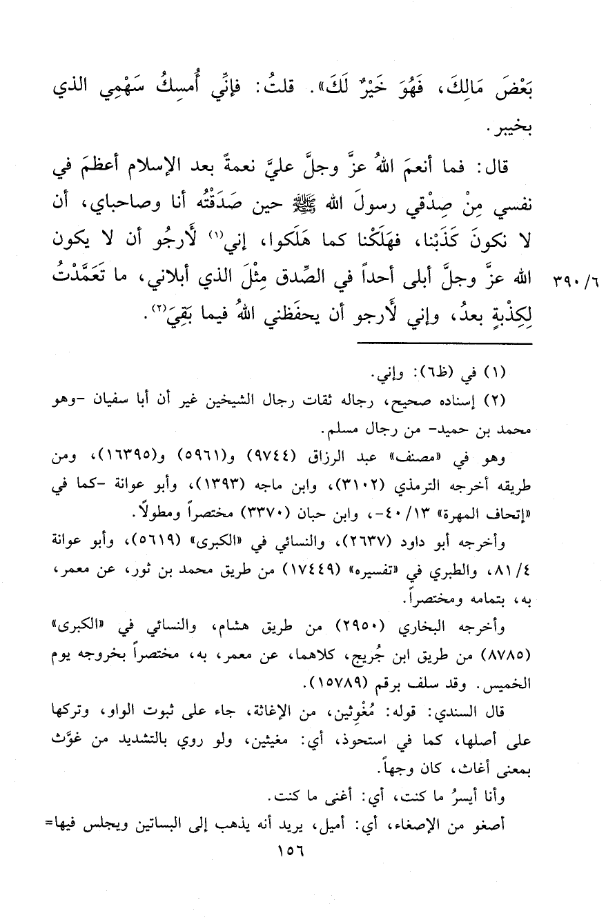 بَعْضَ مَالِكَ، فَهُوَ خَيْرٌ لَكَ "، قُلْتُ: فَإِنِّي أُمْسِكُ سَهْمِي الَّذِي بِخَيْبَرَ قَالَ: فَمَا أَنْعَمَ اللهُ عَزَّ وَجَلَّ عَلَيَّ نِعْمَةً بَعْدَ الْإِسْلَامِ أَعْظَمَ فِي نَفْسِي مِنْ صِدْقِي رَسُولَ اللهِ صَلَّى اللهُ عَلَيْهِ وَسَلَّمَ حِينَ صَدَقْتُهُ أَنَا وَصَاحِبَايَ، أَنْ لَا نَكُونَ كَذَبْنَا، فَهَلَكْنَا كَمَا هَلَكُوا، إِنِّي (١) لَأَرْجُو أَنْ لَا يَكُونَ اللهُ عَزَّ وَجَلَّ أَبْلَى أَحَدًا فِي الصِّدْقِ، مِثْلَ الَّذِي أَبْلَانِي مَا تَعَمَّدْتُ لِكَذْبَةٍ بَعْدُ، وَإِنِّي لَأَرْجُو أَنْ يَحْفَظَنِي اللهُ فِيمَا بَقِيَ (٢)