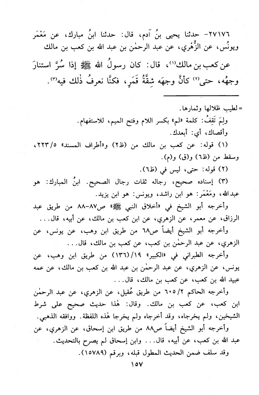 ٢٧١٧٦ - حَدَّثَنَا يَحْيَى بْنُ آدَمَ، قَالَ: حَدَّثَنَا ابْنُ مُبَارَكٍ، عَنْ مَعْمَرٍ، وَيُونُسَ، عَنِ الزُّهْرِيِّ، عَنْ عَبْدِ الرَّحْمَنِ بْنِ عَبْدِ اللهِ بْنِ كَعْبِ بْنِ مَالِكٍ، عَنْ كَعْبِ بْنِ مَالِكٍ (١) قَالَ: " كَانَ رَسُولُ اللهِ صَلَّى اللهُ عَلَيْهِ وَسَلَّمَ إِذَا سُرَّ اسْتَنَارَ وَجْهُهُ حَتَّى (٢) كَأَنَّ وَجْهَهُ شِقَّةُ قَمَرٍ "، فَكُنَّا نَعْرِفُ ذَلِكَ فِيهِ (٣)