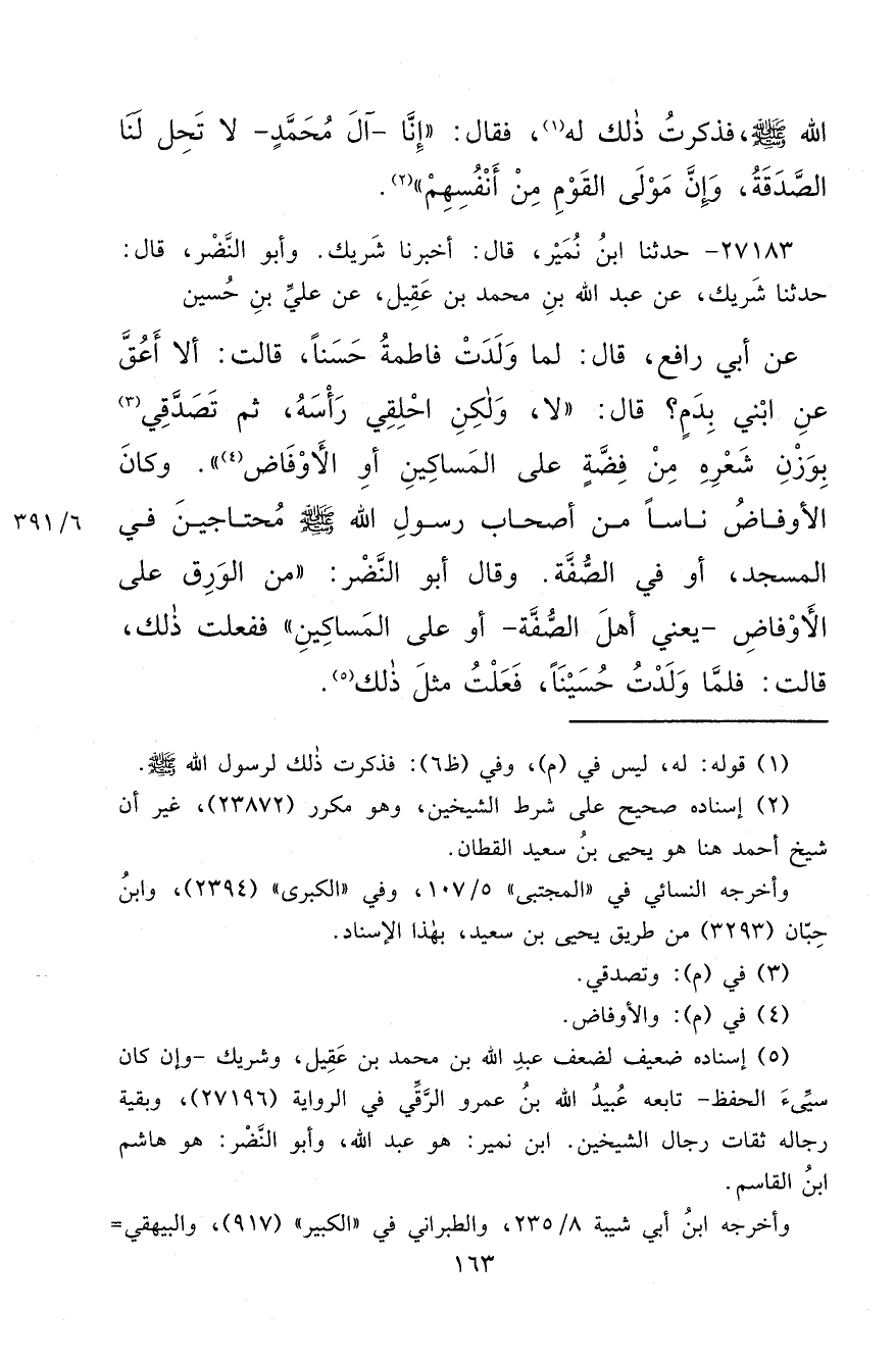 ٢٧١٨٣ - حَدَّثَنَا ابْنُ نُمَيْرٍ، قَالَ: أَخْبَرَنَا شَرِيكٌ، وَأَبُو النَّضْرِ قَالَ: حَدَّثَنَا شَرِيكٌ، عَنْ عَبْدِ اللهِ بْنِ مُحَمَّدِ بْنِ عَقِيلٍ، عَنْ عَلِيِّ بْنِ حُسَيْنٍ، عَنْ أَبِي رَافِعٍ قَالَ: لَمَّا وَلَدَتْ فَاطِمَةُ حَسَنًا قَالَتْ: أَلَا أَعُقُّ عَنْ ابْنِي بِدَمٍ؟ قَالَ: " لَا، وَلَكِنْ احْلِقِي رَأْسَهُ ثُمَّ َتَصَدَّقِي (٣) بِوَزْنِ شَعْرِهِ مِنْ فِضَّةٍ عَلَى الْمَسَاكِينِ أَوِ الْأَوْفَاضِ " (٤) ، وَكَانَ الْأَوْفَاضُ نَاسًا مِنْ أَصْحَابِ رَسُولِ اللهِ صَلَّى اللهُ عَلَيْهِ وَسَلَّمَ مُحْتَاجِينَ فِي الْمَسْجِدِ، أَوْ فِي الصُّفَّةِ، وَقَالَ أَبُو النَّضْرِ: " مِنَ الْوَرِقِ عَلَى الْأَوْفَاضِ ـ يَعْنِي أَهْلَ الصُّفَّةِ ـ أَوْ عَلَى الْمَسَاكِينِ " فَفَعَلْتُ ذَلِكَ، قَالَتْ: فَلَمَّا وَلَدْتُ حُسَيْنًا فَعَلْتُ مِثْلَ ذَلِكَ (٥)
