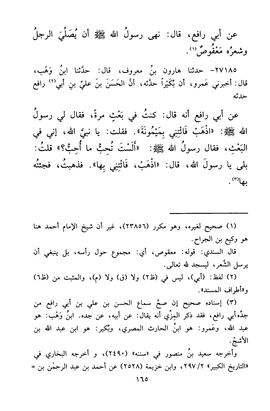 عَنْ أَبِي رَافِعٍ قَالَ: " نَهَى رَسُولُ اللهِ صَلَّى اللهُ عَلَيْهِ وَسَلَّمَ أَنْ يُصَلِّيَ الرَّجُلُ وَشَعْرُهُ مَعْقُوصٌ " (١)