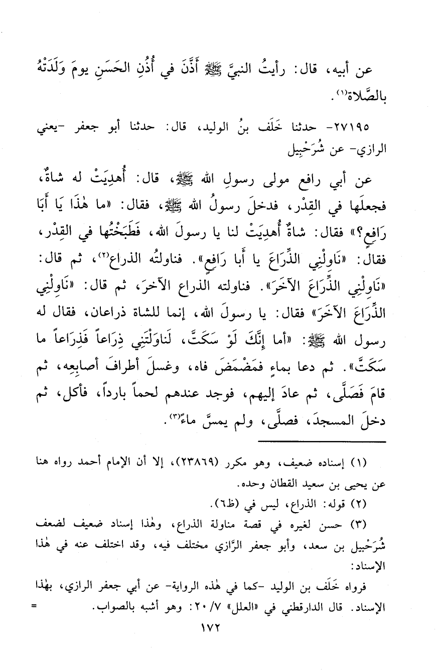 ٢٧١٩٥ - حَدَّثَنَا خَلَفُ بْنُ الْوَلِيدِ، قَالَ: حَدَّثَنَا أَبُو جَعْفَرٍ يَعْنِي الرَّازِيَّ، عَنْ شُرَحْبِيلَ، عَنْ أَبِي رَافِعٍ مَوْلَى رَسُولِ اللهِ صَلَّى اللهُ عَلَيْهِ وَسَلَّمَ قَالَ: أُهْدِيَتْ لَهُ شَاةٌ فَجَعَلَهَا فِي الْقِدْرِ، فَدَخَلَ رَسُولُ اللهِ صَلَّى اللهُ عَلَيْهِ وَسَلَّمَ فَقَالَ: " مَا هَذَا يَا أَبَا رَافِعٍ؟ "، فَقَالَ: شَاةٌ أُهْدِيَتْ لَنَا يَا رَسُولَ اللهِ، فَطَبَخْتُهَا فِي الْقِدْرِ، فَقَالَ: " نَاوِلْنِي الذِّرَاعَ يَا أَبَا رَافِعٍ "، فَنَاوَلْتُهُ الذِّرَاعَ (٢) ثُمَّ قَالَ: " نَاوِلْنِي الذِّرَاعَ الْآخَرَ "، فَنَاوَلْتُهُ الذِّرَاعَ الْآخَرَ، ثُمَّ قَالَ: " نَاوِلْنِي الذِّرَاعَ الْآخَرَ "، فَقَالَ: يَا رَسُولَ اللهِ، إِنَّمَا لِلشَّاةِ ذِرَاعَانِ، فَقَالَ لَهُ رَسُولُ اللهِ صَلَّى اللهُ عَلَيْهِ وَسَلَّمَ: " أَمَا إِنَّكَ لَوْ سَكَتَّ لَنَاوَلْتَنِي ذِرَاعًا، فَذِرَاعًا مَا سَكَتَّ "، ثُمَّ دَعَا بِمَاءٍ فَمَضْمَضَ فَاهُ وَغَسَلَ أَطْرَافَ أَصَابِعِهِ، ثُمَّ قَامَ فَصَلَّى، ثُمَّ عَادَ إِلَيْهِمْ فَوَجَدَ عِنْدَهُمْ لَحْمًا بَارِدًا فَأَكَلَ، ثُمَّ دَخَلَ الْمَسْجِدَ فَصَلَّى وَلَمْ يَمَسَّ مَاءً (٣)