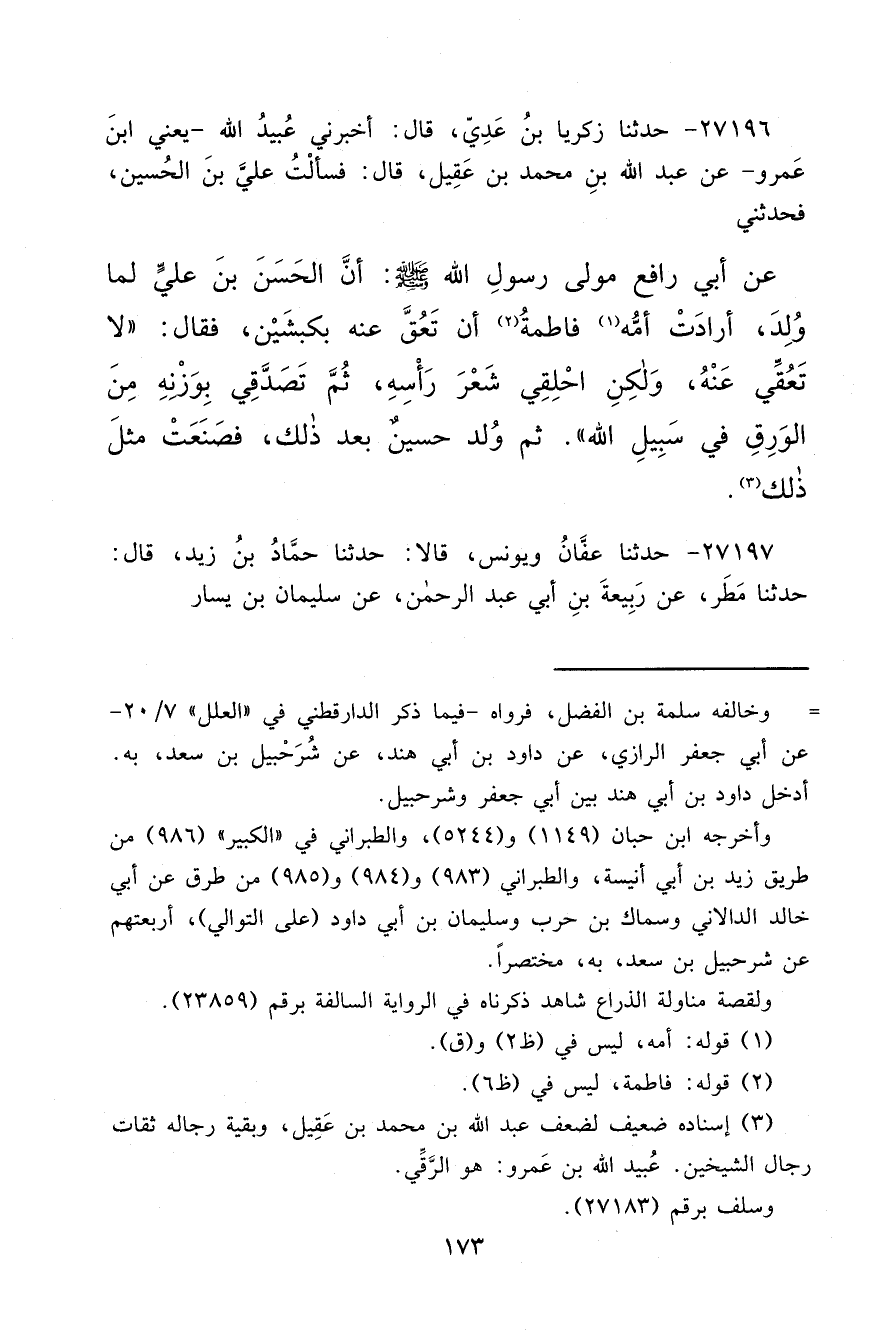 ٢٧١٩٦ - حَدَّثَنَا زَكَرِيَّا بْنُ عَدِيٍّ، قَالَ: أَخْبَرَنِي عُبَيْدُ اللهِ يَعْنِي ابْنَ عَمْرٍو، عَنْ عَبْدِ اللهِ بْنِ مُحَمَّدِ بْنِ عَقِيلٍ قَالَ: فَسَأَلْتُ عَلِيَّ بْنَ الْحُسَيْنِ فَحَدَّثَنِي، عَنْ أَبِي رَافِعٍ مَوْلَى رَسُولِ اللهِ صَلَّى اللهُ عَلَيْهِ وَسَلَّمَ، أَنَّ الْحَسَنَ بْنَ عَلِيٍّ لَمَّا وُلِدَ أَرَادَتْ أُمُّهُ (١) فَاطِمَةُ (٢) أَنْ تَعُقَّ عَنْهُ بِكَبْشَيْنِ، فَقَالَ: " لَا تَعُقِّي عَنْهُ، وَلَكِنْ احْلِقِي شَعْرَ رَأْسِهِ، ثُمَّ تَصَدَّقِي بِوَزْنِهِ مِنَ الْوَرِقِ فِي سَبِيلِ اللهِ "، ثُمَّ وُلِدَ حُسَيْنٌ بَعْدَ ذَلِكَ فَصَنَعَتْ مِثْلَ ذَلِكَ (٣)