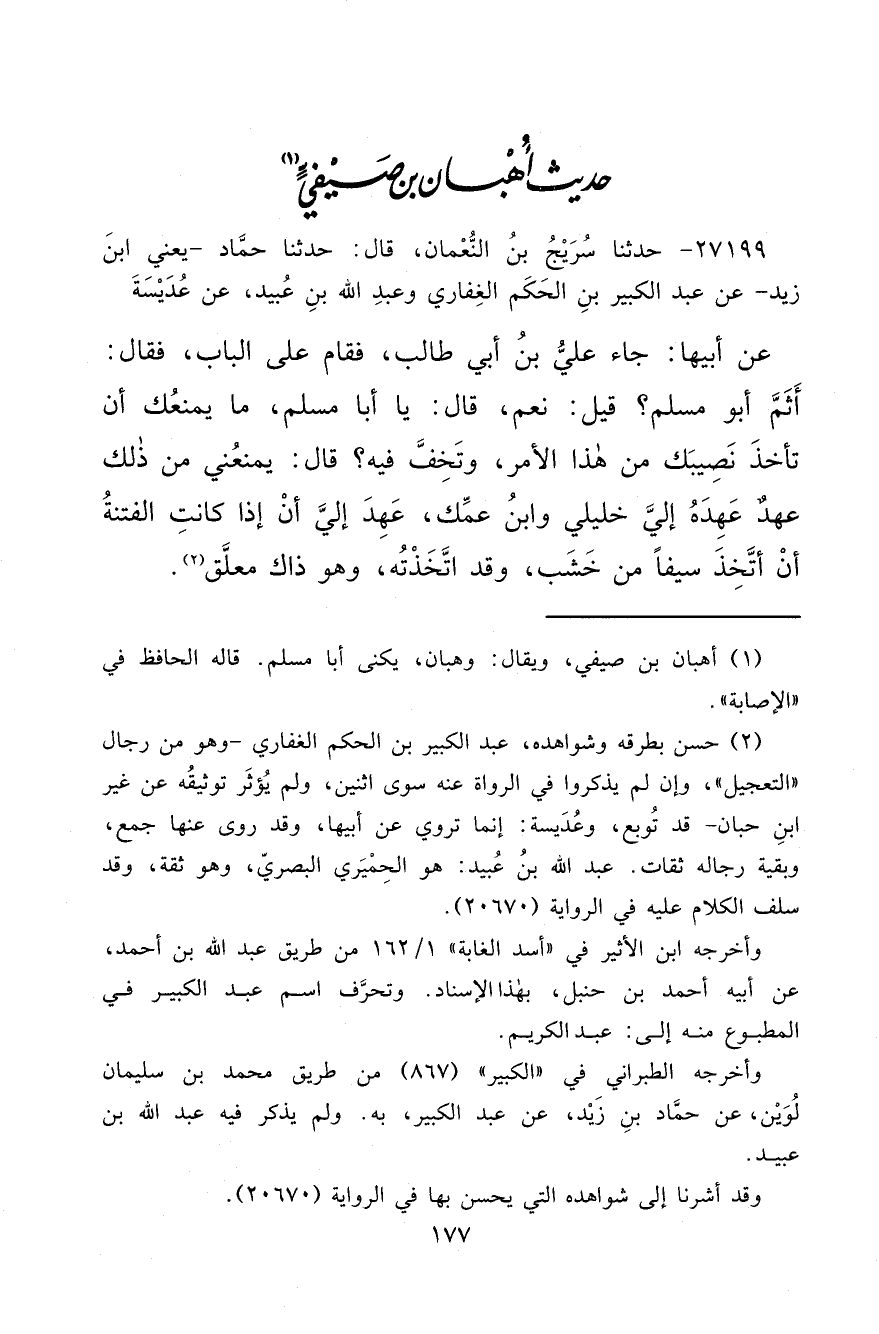 ٢٧١٩٩ - حَدَّثَنَا سُرَيْجُ بْنُ النُّعْمَانِ، قَالَ: حَدَّثَنَا حَمَّادٌ يَعْنِى ابْنَ زَيْدٍ، عَنْ عَبْدِ الْكَبِيرِ بْنِ الْحَكَمِ الْغِفَارِيِّ، وَعَبْدِ اللهِ بْنِ عُبَيْدٍ، عَنْ عُدَيْسَةَ، عَنْ أَبِيهَا، جَاءَ عَلِيُّ بْنُ أَبِي طَالِبٍ فَقَامَ عَلَى الْبَابِ فَقَالَ: أَثَمَّ أَبُو مُسْلِمٍ، قِيلَ: نَعَمْ، قَالَ: يَا أَبَا مُسْلِمٍ، مَا يَمْنَعُكَ أَنْ تَأْخُذَ نَصِيبَكَ مِنْ هَذَا الْأَمْرِ وَتُخِفْ فِيهِ؟ قَالَ: يَمْنَعُنِي مِنْ ذَلِكَ عَهْدٌ عَهِدَهُ إِلَيَّ خَلِيلِي وَابْنُ عَمِّكَ، " عَهِدَ إِلَيَّ أَنْ إِذَا كَانَتِ الْفِتْنَةُ أَنْ أَتَّخِذَ سَيْفًا مِنْ خَشَبٍ "، وَقَدْ اتَّخَذْتُهُ وَهُوَ ذَاكَ مُعَلَّقٌ (٢)