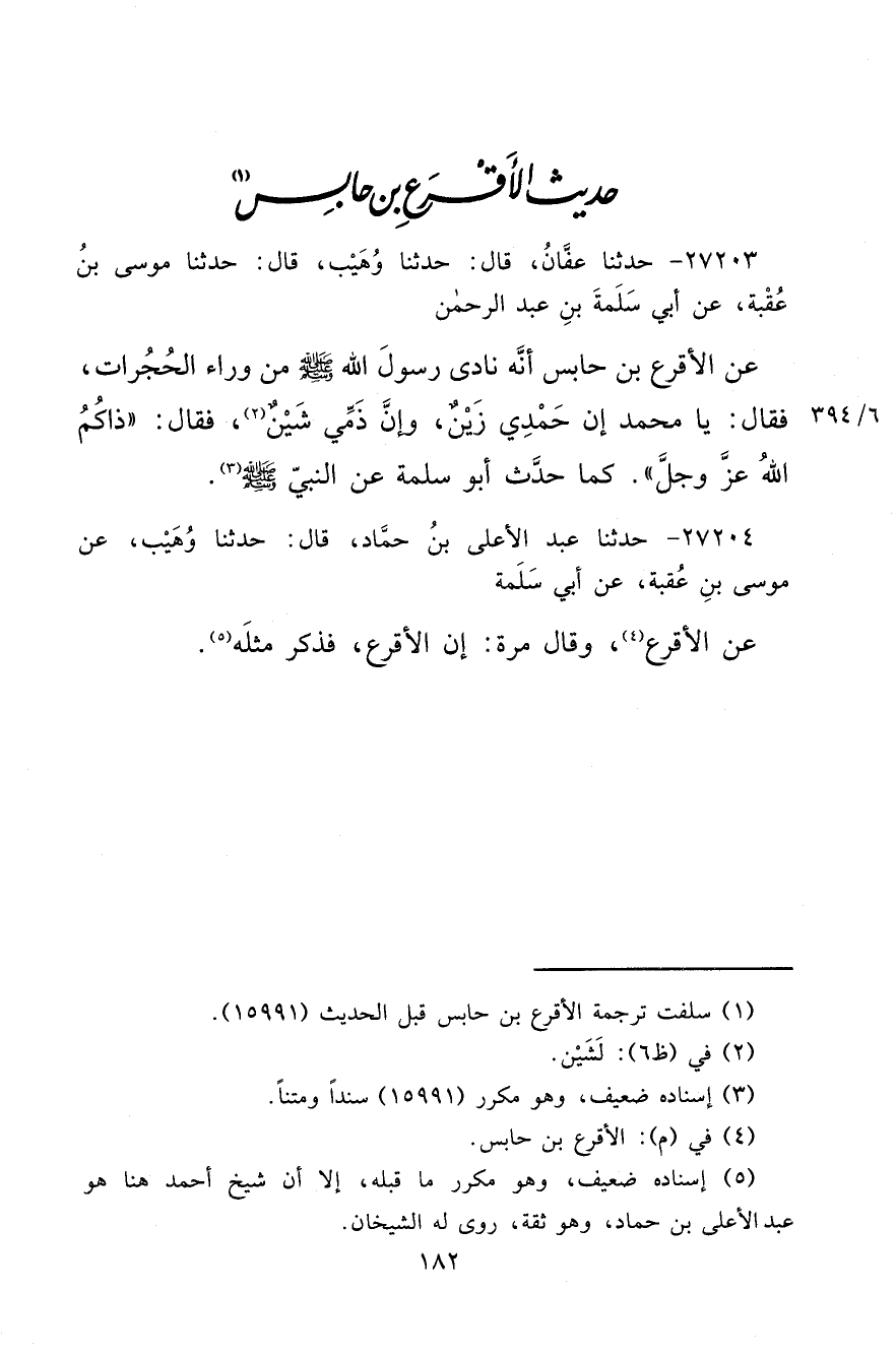 ٢٧٢٠٤ - حَدَّثَنَا عَبْدُ الْأَعْلَى بْنُ حَمَّادٍ، قَالَ: حَدَّثَنَا وُهَيْبٌ، عَنْ مُوسَى بْنِ عُقْبَةَ، عَنْ أَبِي سَلَمَةَ، عَنْ الْأَقْرَعِ (٤) ، وَقَالَ مَرَّةً: إِنَّ الْأَقْرَعَ، فَذَكَرَ مِثْلَهُ (٥)