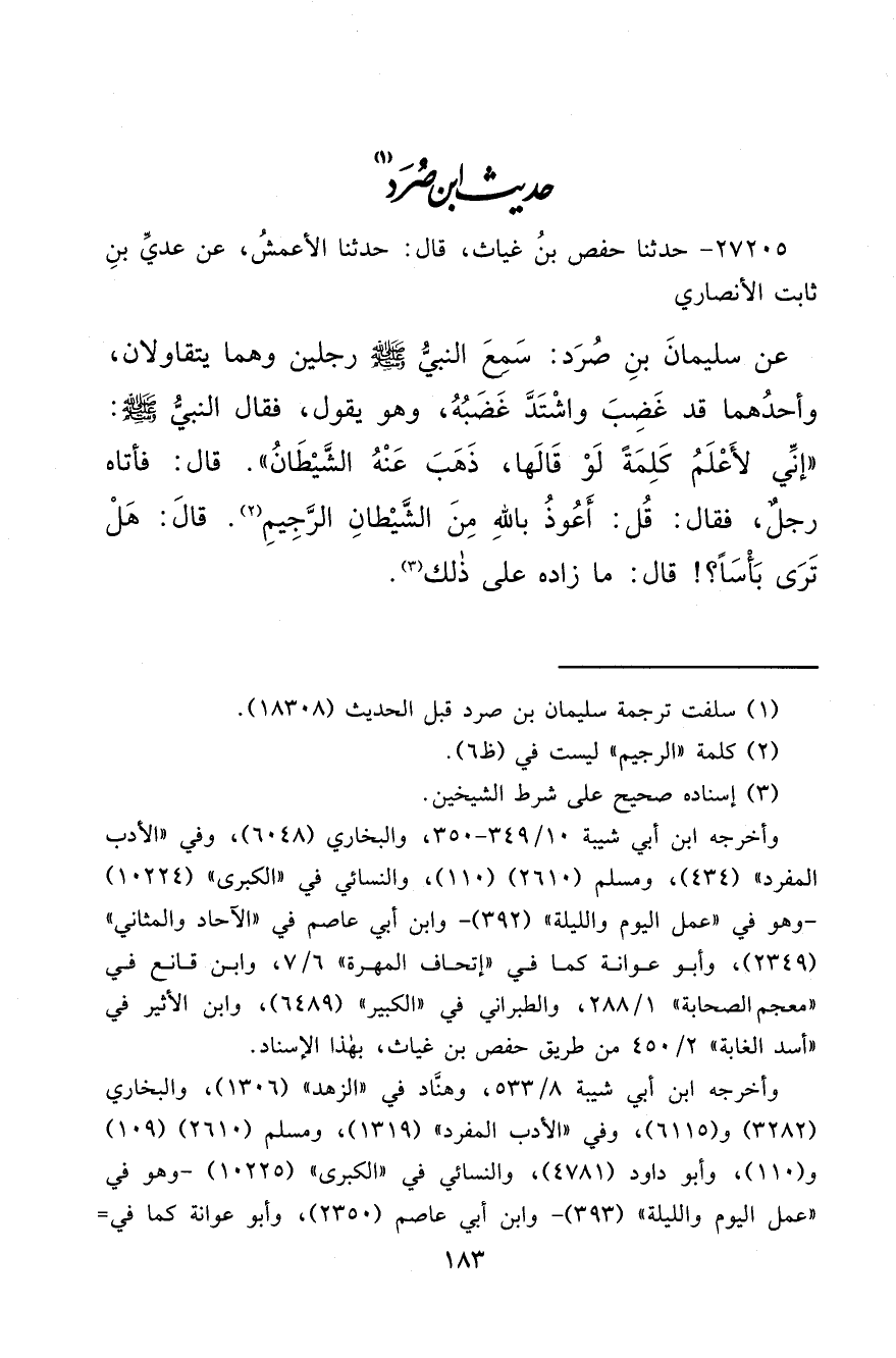 ٢٧٢٠٥ - حَدَّثَنَا حَفْصُ بْنُ غِيَاثٍ، قَالَ: حَدَّثَنَا الْأَعْمَشُ، عَنْ عَدِيِّ بْنِ ثَابِتٍ الْأَنْصَارِيِّ، عَنْ سُلَيْمَانَ بْنِ صُرَدٍ، سَمِعَ النَّبِيُّ صَلَّى اللهُ عَلَيْهِ وَسَلَّمَ رَجُلَيْنِ وَهُمَا يَتَقَاوَلَانِ، وَأَحَدُهُمَا قَدْ غَضِبَ وَاشْتَدَّ غَضَبُهُ وَهُوَ يَقُولُ: فَقَالَ النَّبِيُّ صَلَّى اللهُ عَلَيْهِ وَسَلَّمَ: " إِنِّي لَأَعْلَمُ كَلِمَةً لَوْ قَالَهَا ذَهَبَ عَنْهُ الشَّيْطَانُ "، قَالَ: فَأَتَاهُ رَجُلٌ فَقَالَ: قُلْ أَعُوذُ بِاللهِ مِنَ الشَّيْطَانِ الرَّجِيمِ (٢) ، قَالَ: هَلْ تَرَى بَأْسًا؟ قَالَ: مَا زَادَهُ عَلَى ذَلِكَ (٣)