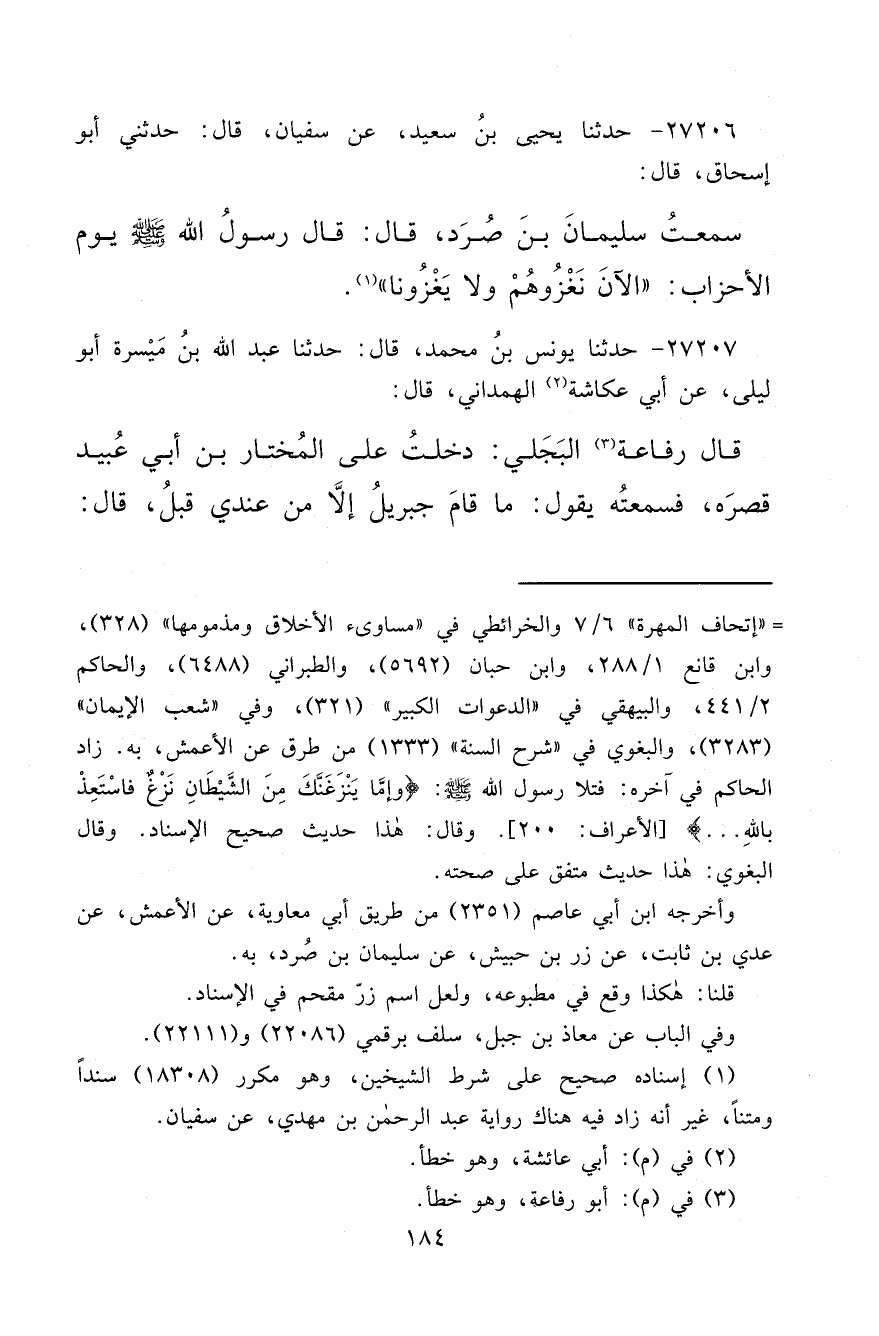 ٢٧٢٠٦ - حَدَّثَنَا يَحْيَى بْنُ سَعِيدٍ، عَنْ سُفْيَانَ، قَالَ: حَدَّثَنِي أَبُو إِسْحَاقَ، قَالَ: سَمِعْتُ سُلَيْمَانَ بْنَ صُرَدٍ قَالَ: قَالَ رَسُولُ اللهِ صَلَّى اللهُ عَلَيْهِ وَسَلَّمَ يَوْمَ الْأَحْزَابِ: " الْآنَ نَغْزُوهُمْ وَلَا يَغْزُونَا " (١)