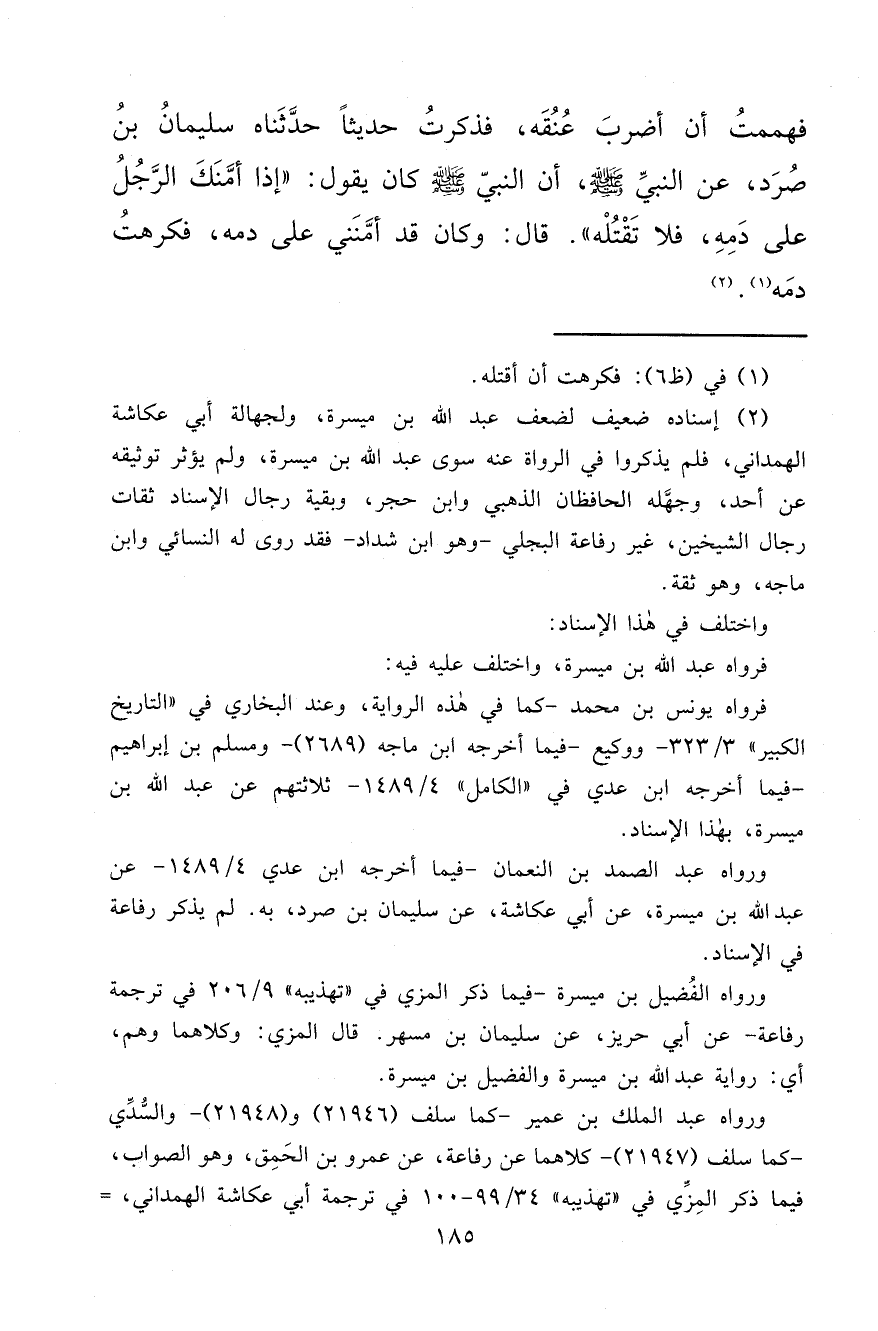 فَهَمَمْتُ أَنْ أَضْرِبَ عُنُقَهُ، فَذَكَرْتُ حَدِيثًا حَدَّثَنَاهُ سُلَيْمَانُ بْنُ صُرَدٍ، عَنِ النَّبِيِّ صَلَّى اللهُ عَلَيْهِ وَسَلَّمَ، أَنَّ النَّبِيَّ صَلَّى اللهُ عَلَيْهِ وَسَلَّمَ كَانَ يَقُولُ: " إِذَا أَمَّنَكَ الرَّجُلُ عَلَى دَمِهِ فَلَا تَقْتُلْهُ "، قَالَ: وَكَانَ قَدْ أَمَّنَنِي عَلَى دَمِهِ فَكَرِهْتُ دَمَهُ (١) (٢)