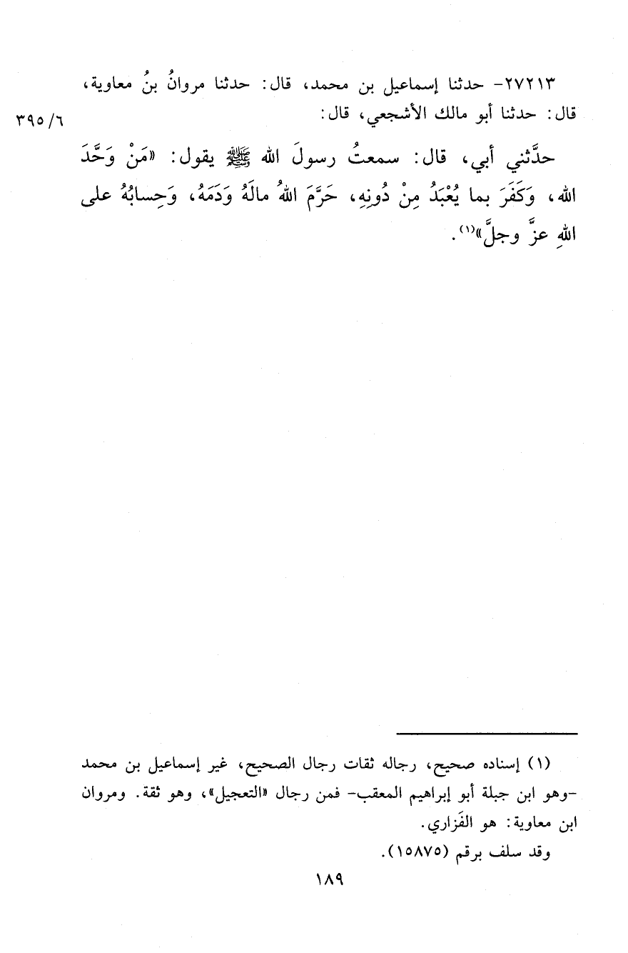 ٢٧٢١٣ - حَدَّثَنَا إِسْمَاعِيلُ بْنُ مُحَمَّدٍ، قَالَ: حَدَّثَنَا مَرْوَانُ بْنُ مُعَاوِيَةَ، قَالَ: حَدَّثَنَا أَبُو مَالِكٍ الْأَشْجَعِيُّ، قَالَ: حَدَّثَنِي أَبِي، قَالَ: سَمِعْتُ رَسُولَ اللهِ صَلَّى اللهُ عَلَيْهِ وَسَلَّمَ يَقُولُ: " مَنْ وَحَّدَ اللهَ وَكَفَرَ بِمَا يُعْبَدُ مِنْ دُونِهِ حَرَّمَ اللهُ مَالَهُ وَدَمَهُ وَحِسَابُهُ عَلَى اللهِ عَزَّ وَجَلَّ " (١)