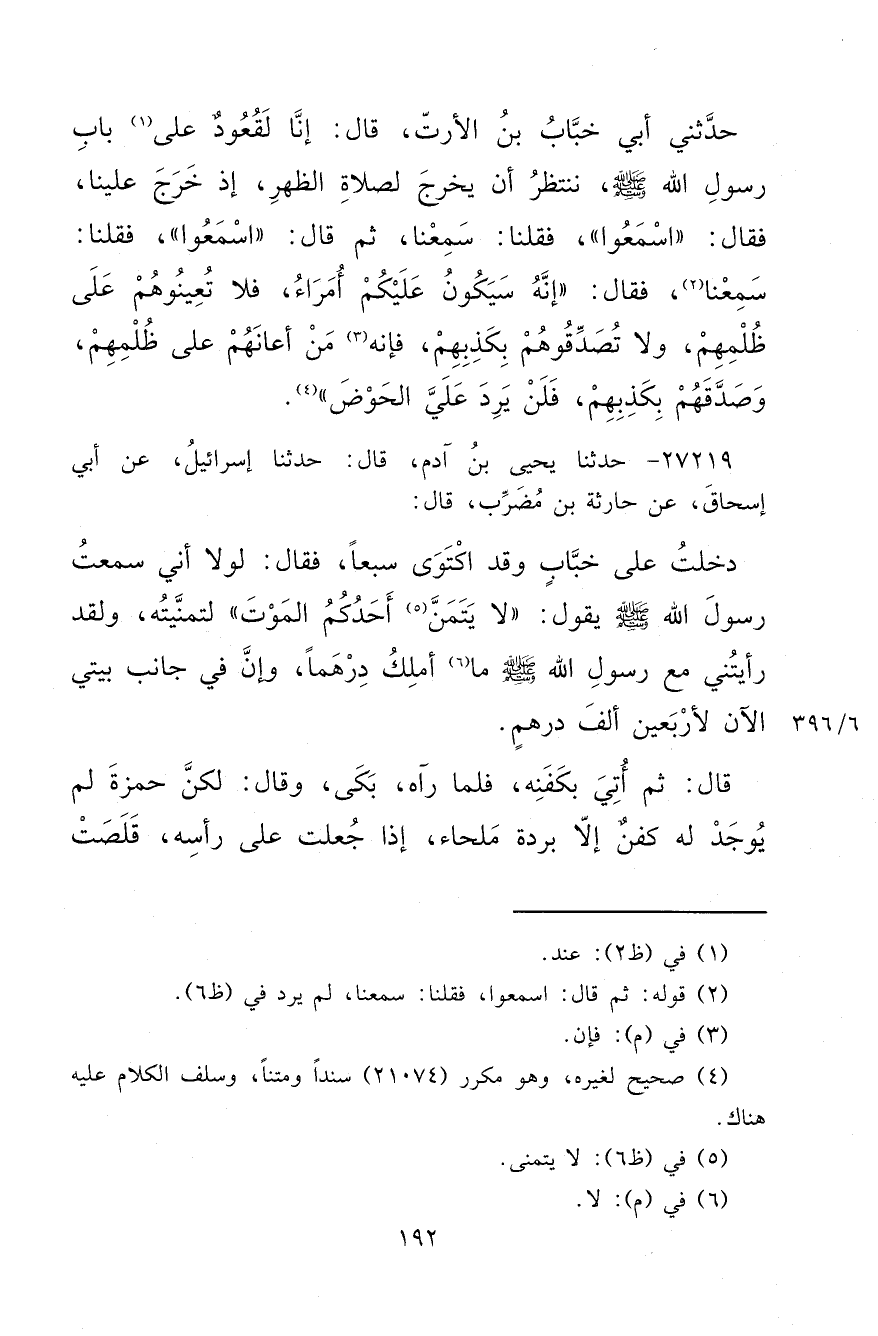 ٢٧٢١٩ - حَدَّثَنَا يَحْيَى بْنُ آدَمَ، قَالَ: حَدَّثَنَا إِسْرَائِيلُ، عَنْ أَبِي إِسْحَاقَ، عَنْ حَارِثَةَ بْنِ مُضَرِّبٍ قَالَ: دَخَلْتُ عَلَى خَبَّابٍ وَقَدِ اكْتَوَى سَبْعًا فَقَالَ: لَوْلَا أَنِّي سَمِعْتُ رَسُولَ اللهِ صَلَّى اللهُ عَلَيْهِ وَسَلَّمَ يَقُولُ: " لَا يَتَمَنَّ (٥) أَحَدُكُمُ الْمَوْتَ "، لَتَمَنَّيْتُهُ، وَلَقَدْ رَأَيْتُنِي مَعَ رَسُولِ اللهِ صَلَّى اللهُ عَلَيْهِ وَسَلَّمَ مَا (٦) أَمْلِكُ دِرْهَمًا، وَإِنَّ فِي جَانِبِ بَيْتِي الْآنَ لَأَرْبَعِينَ أَلْفَ دِرْهَمٍ، قَالَ: ثُمَّ أُتِيَ بِكَفَنِهِ فَلَمَّا رَآهُ بَكَى وَقَالَ: لَكِنَّ حَمْزَةَ لَمْ يُوجَدْ لَهُ كَفَنٌ إِلَّا بُرْدَةٌ مَلْحَاءُ، إِذَا جُعِلَتْ عَلَى رَأْسِهِ قَلَصَتْ