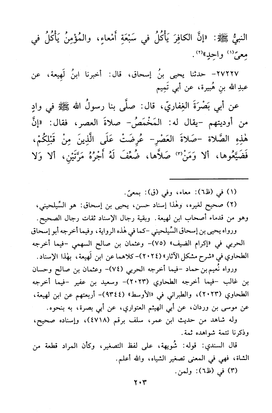 ٢٧٢٢٧ - حَدَّثَنَا يَحْيَى بْنُ إِسْحَاقَ، قَالَ: أَخْبَرَنَا ابْنُ لَهِيعَةَ، عَنْ عَبْدِ اللهِ بْنِ هُبَيْرَةَ، عَنْ أَبِي تَمِيمٍ، عَنْ أَبِي بَصْرَةَ الْغِفَارِيِّ قَالَ: صَلَّى بِنَا رَسُولُ اللهِ صَلَّى اللهُ عَلَيْهِ وَسَلَّمَ فِي وَادٍ مِنْ أَوْدِيَتِهِمْ يُقَالُ لَهُ: الْمُخَمَّصُ صَلَاةَ الْعَصْرِ فَقَالَ: " إِنَّ هَذِهِ الصَّلَاةَ - صَلَاةَ الْعَصْرِ - عُرِضَتْ عَلَى الَّذِينَ مِنْ قَبْلِكُمْ فَضَيَّعُوهَا، أَلَا وَمَنْ (٣) صَلَّاهَا ضُعِّفَ لَهُ أَجْرُهُ مَرَّتَيْنِ، أَلَا وَلَا