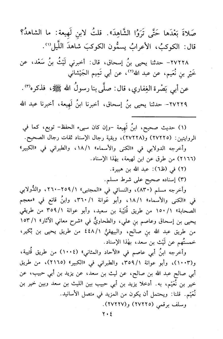 ٢٧٢٢٨ - حَدَّثَنَا يَحْيَى بْنُ إِسْحَاقَ، قَالَ: أَخْبَرَنِي لَيْثُ بْنُ سَعْدٍ، عَنْ خَيْرِ بْنِ نُعَيْمٍ، عَنْ عَبْدِ اللهِ (٢) ، عَنْ أَبِي تَمِيمٍ الْجَيْشَانِيِّ، عَنْ أَبِي بَصْرَةَ الْغِفَارِيِّ قَالَ: صَلَّى بِنَا رَسُولُ اللهِ صَلَّى اللهُ عَلَيْهِ وَسَلَّمَ، فَذَكَرَهُ (٣)
