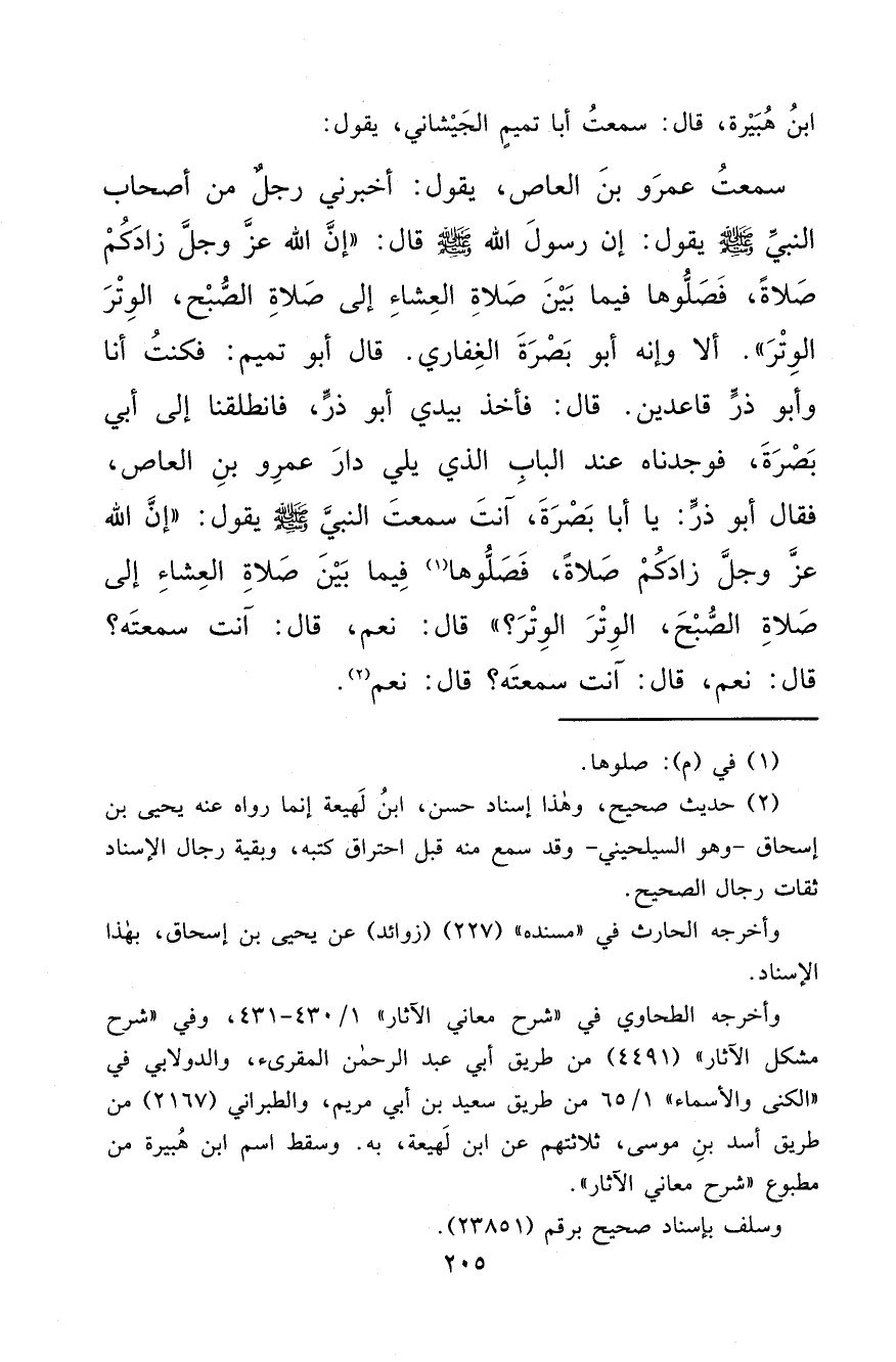 بْنُ هُبَيْرَةَ قَالَ: سَمِعْتُ أَبَا تَمِيمٍ الْجَيْشَانِيَّ يَقُولُ: سَمِعْتُ عَمْرَو بْنَ الْعَاصِ يَقُولُ: أَخْبَرَنِي رَجُلٌ مِنْ أَصْحَابِ النَّبِيِّ صَلَّى اللهُ عَلَيْهِ وَسَلَّمَ يَقُولُ: إِنَّ رَسُولَ اللهِ صَلَّى اللهُ عَلَيْهِ وَسَلَّمَ قَالَ: " إِنَّ اللهَ عَزَّ وَجَلَّ زَادَكُمْ صَلَاةً فَصَلُّوهَا فِيمَا بَيْنَ صَلَاةِ الْعِشَاءِ إِلَى صَلَاةِ الصُّبْحِ الْوَتْرُ الْوَتْرُ "، أَلَا وَإِنَّهُ أَبُو بَصْرَةَ الْغِفَارِيُّ، قَالَ أَبُو تَمِيمٍ: فَكُنْتُ أَنَا وَأَبُو ذَرٍّ قَاعِدَيْنِ، قَالَ: فَأَخَذَ بِيَدِي أَبُو ذَرٍّ فَانْطَلَقْنَا إِلَى أَبِي بَصْرَةَ فَوَجَدْنَاهُ عِنْدَ الْبَابِ الَّذِي يَلِي دَارَ عَمْرِو بْنِ الْعَاصِ، فَقَالَ أَبُو ذَرٍّ: يَا أَبَا بَصْرَةَ آنْتَ سَمِعْتَ النَّبِيَّ صَلَّى اللهُ عَلَيْهِ وَسَلَّمَ يَقُولُ: " إِنَّ اللهَ عَزَّ وَجَلَّ زَادَكُمْ صَلَاةً، فَصَلُّوهَا (١) فِيمَا بَيْنَ صَلَاةِ الْعِشَاءِ إِلَى صَلَاةِ الصُّبْحِ الْوَتْرُ الْوَتْرُ؟ " قَالَ: نَعَمْ، قَالَ: أَنْتَ سَمِعْتَهُ؟ قَالَ: نَعَمْ، قَالَ: أَنْتَ سَمِعْتَهُ؟ قَالَ: نَعَمْ (٢)