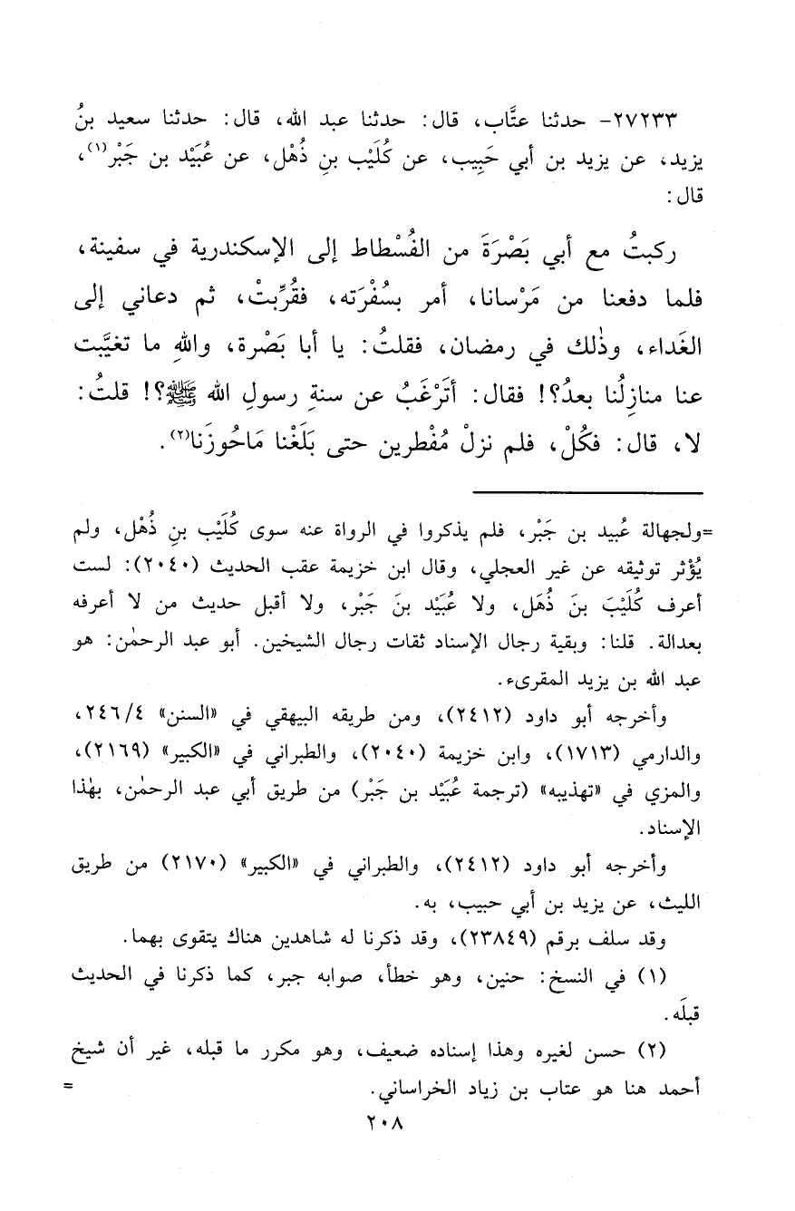 ٢٧٢٣٣ - حَدَّثَنَا عَتَّابٌ، قَالَ: حَدَّثَنَا عَبْدُ اللهِ، قَالَ: حَدَّثَنَا سَعِيدُ بْنُ يَزِيدَ، عَنْ يَزِيدَ بْنِ أَبِي حَبِيبٍ، عَنْ كُلَيْبِ بْنِ ذُهْلٍ، عَنْ عُبَيْدِ بْنِ جَبْرٍ (١) قَالَ: رَكِبْتُ مَعَ أَبِي بَصْرَةَ مِنَ الْفُسْطَاطِ إِلَى الْإِسْكَنْدَرِيَّةِ فِي سَفِينَةٍ، فَلَمَّا دَفَعْنَا مِنْ مَرْسَانَا أَمَرَ بِسُفْرَتِهِ فَقُرِّبَتْ، ثُمَّ دَعَانِي إِلَى الْغَدَاءِ وَذَلِكَ فِي رَمَضَانَ، فَقُلْتُ: يَا أَبَا بَصْرَةَ، وَاللهِ مَا تَغَيَّبَتْ عَنَّا مَنَازِلُنَا بَعْدُ؟ فَقَالَ: " أَتَرْغَبُ عَنْ سُنَّةِ رَسُولِ اللهِ صَلَّى اللهُ عَلَيْهِ وَسَلَّمَ؟ " قُلْتُ: لَا، قَالَ: فَكُلْ فَلَمْ نَزَلْ مُفْطِرِينَ حَتَّى بَلَغْنَا مَاحُوزَنَا، (٢)