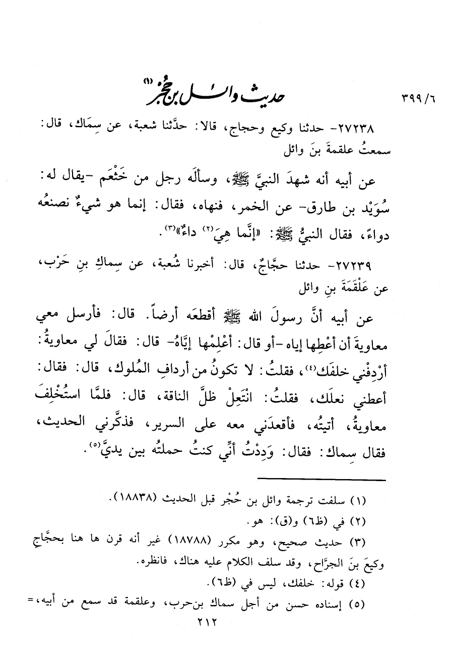 ٢٧٢٣٩ - حَدَّثَنَا حَجَّاجٌ، قَالَ: أَخْبَرَنَا شُعْبَةُ، عَنْ سِمَاكِ بْنِ حَرْبٍ، عَنْ عَلْقَمَةَ بْنِ وَائِلٍ، عَنْ أَبِيهِ، " أَنَّ رَسُولَ اللهِ صَلَّى اللهُ عَلَيْهِ وَسَلَّمَ أَقْطَعَهُ أَرْضًا، قَالَ: فَأَرْسَلَ مَعِي مُعَاوِيَةَ أَنْ أَعْطِهَا إِيَّاهُ ـ أَوْ قَالَ: أَعْلِمْهَا إِيَّاهُ ـ " قَالَ: فَقَالَ لِي مُعَاوِيَةُ: أَرْدِفْنِي خَلْفَكَ، (٤) فَقُلْتُ: لَا تَكُونُ مِنْ أَرْدَافِ الْمُلُوكِ، قَالَ: فَقَالَ: أَعْطِنِي نَعْلَكَ، فَقُلْتُ: انْتَعِلْ ظِلَّ النَّاقَةِ، قَالَ: فَلَمَّا اسْتُخْلِفَ مُعَاوِيَةُ أَتَيْتُهُ، فَأَقْعَدَنِي مَعَهُ عَلَى السَّرِيرِ، فَذَكَّرَنِي الْحَدِيثَ فَقَالَ سِمَاكٌ فَقَالَ: " وَدِدْتُ أَنِّي كُنْتُ حَمَلْتُهُ بَيْنَ يَدَيَّ " (٥)