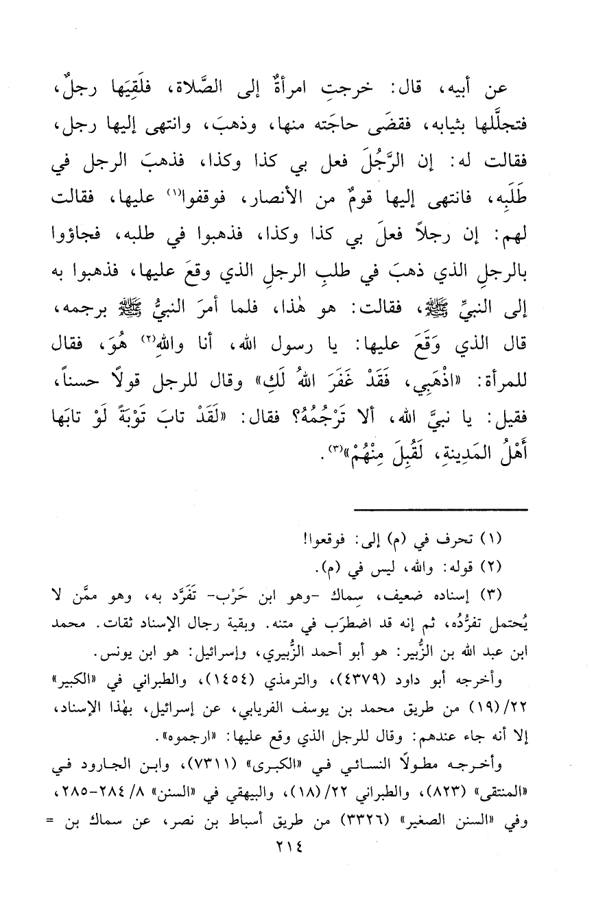 عَنْ أَبِيهِ قَالَ: خَرَجَتْ امْرَأَةٌ إِلَى الصَّلَاةِ فَلَقِيَهَا رَجُلٌ فَتَجَلَّلَهَا بِثِيَابِهِ فَقَضَى حَاجَتَهُ مِنْهَا، وَذَهَبَ وَانْتَهَى إِلَيْهَا رَجُلٌ فَقَالَتْ لَهُ: إِنَّ الرَّجُلَ فَعَلَ بِي كَذَا وَكَذَا، فَذَهَبَ الرَّجُلُ فِي طَلَبِهِ فَانْتَهَى إِلَيْهَا قَوْمٌ مِنَ الْأَنْصَارِ، فَوَقَفُوا (١) عَلَيْهَا، فَقَالَتْ لَهُمْ: إِنَّ رَجُلًا فَعَلَ بِي كَذَا وَكَذَا، فَذَهَبُوا فِي طَلَبِهِ، فَجَاءُوا بِالرَّجُلِ الَّذِي ذَهَبَ فِي طَلَبِ الرَّجُلِ الَّذِي وَقَعَ عَلَيْهَا، فَذَهَبُوا بِهِ إِلَى النَّبِيِّ صَلَّى اللهُ عَلَيْهِ وَسَلَّمَ فَقَالَتْ: هُوَ هَذَا، فَلَمَّا أَمَرَ النَّبِيُّ صَلَّى اللهُ عَلَيْهِ وَسَلَّمَ بِرَجْمِهِ قَالَ الَّذِي وَقَعَ عَلَيْهَا: يَا رَسُولَ اللهِ، أَنَا وَاللهِ (٢) هُوَ، فَقَالَ لِلْمَرْأَةِ: " اذْهَبِي فَقَدْ غَفَرَ اللهُ لَكِ "، وَقَالَ لِلرَّجُلِ قَوْلًا حَسَنًا، فَقِيلَ: يَا نَبِيَّ اللهِ، أَلَا تَرْجُمُهُ، فَقَالَ: " لَقَدْ تَابَ تَوْبَةً لَوْ تَابَهَا أَهْلُ الْمَدِينَةِ لَقُبِلَ مِنْهُمْ " (٣)