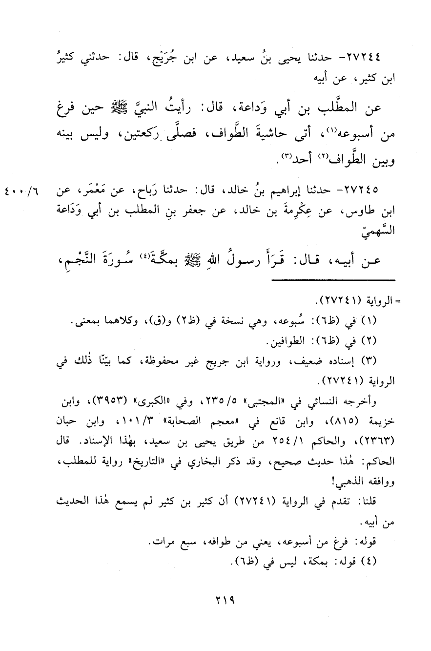 ٢٧٢٤٤ - حَدَّثَنَا يَحْيَى بْنُ سَعِيدٍ، عَنْ ابْنِ جُرَيْجٍ قَالَ: حَدَّثَنِي كَثِيرُ بْنُ كَثِيرٍ، عَنْ أَبِيهِ، عَنِ الْمُطَّلِبِ بْنِ أَبِي وَدَاعَةَ قَالَ: " رَأَيْتُ النَّبِيَّ صَلَّى اللهُ عَلَيْهِ وَسَلَّمَ حِينَ فَرَغَ مِنْ أُسْبُوعِهِ (١) أَتَى حَاشِيَةَ الطَّوَافِ فَصَلَّى رَكْعَتَيْنِ وَلَيْسَ بَيْنَهُ وَبَيْنَ الطَّوَافِ (٢) أَحَدٌ " (٣)