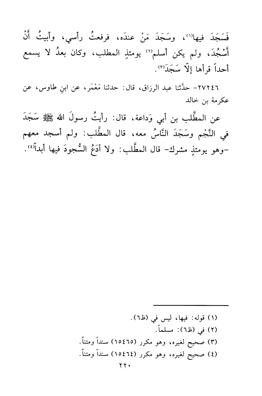 ٢٧٢٤٦ - حَدَّثَنَا عَبْدُ الرَّزَّاقِ، قَالَ: حَدَّثَنَا مَعْمَرٌ، عَنِ ابْنِ طَاوُسٍ، عَنْ عِكْرِمَةَ بْنِ خَالِدٍ، عَنِ الْمُطَّلِبِ بْنِ أَبِي وَدَاعَةَ قَالَ: " رَأَيْتُ رَسُولَ اللهِ صَلَّى اللهُ عَلَيْهِ وَسَلَّمَ سَجَدَ فِي النَّجْمِ، وَسَجَدَ النَّاسُ مَعَهُ "، قَالَ الْمُطَّلِبُ: وَلَمْ أَسْجُدْ مَعَهُمْ - وَهُوَ يَوْمَئِذٍ مُشْرِكٌ -، قَالَ الْمُطَّلِبُ: وَلَا أَدَعُ السُّجُودَ فِيهَا أَبَدًا (٤)