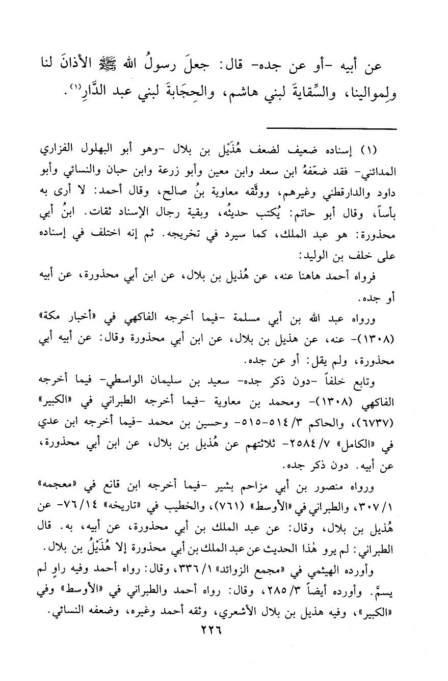 (١) إسناده ضعيف لضعف هُذَيْل بن بلال -وهو أبو البهلول الفزاري المدائني- فقد ضعّفهُ ابن سعد وابن معين وأبو زرعة وابن حبان والنسائي وأبو داود والدارقطني وغيرهم، ووثَّقه معاوية بنُ صالح، وقال أحمد: لا أرى به بأساً، وقال أبو حاتم: يُكتب حديثُه، وبقية رجال الإسناد ثقات. ابنُ أبي محذورة: هو عبد الملك، كما سيرد في تخريجه. ثم إنه اختلف في إسناده على خلف بن الوليد: