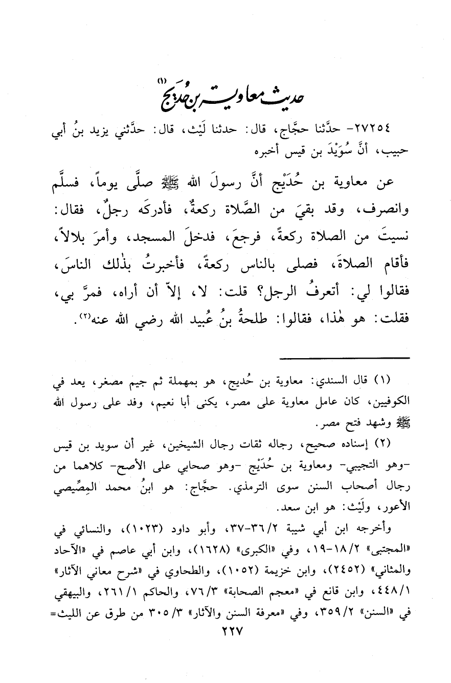 ٢٧٢٥٤ - حَدَّثَنَا حَجَّاجٌ، قَالَ: حَدَّثَنَا لَيْثٌ، قَالَ: حَدَّثَنِي يَزِيدُ بْنُ أَبِي حَبِيبٍ، أَنَّ سُوَيْدَ بْنَ قَيْسٍ أَخْبَرَهُ، عَنْ مُعَاوِيَةَ بْنِ حُدَيْجٍ، " " أَنَّ رَسُولَ اللهِ صَلَّى اللهُ عَلَيْهِ وَسَلَّمَ صَلَّى يَوْمًا فَسَلَّمَ وَانْصَرَفَ وَقَدْ بَقِيَ مِنَ الصَّلَاةِ رَكْعَةٌ، فَأَدْرَكَهُ رَجُلٌ فَقَالَ: نَسِيتَ مِنَ الصَّلَاةِ رَكْعَةً، فَرَجَعَ فَدَخَلَ الْمَسْجِدَ، وَأَمَرَ بِلَالًا فَأَقَامَ الصَّلَاةَ، فَصَلَّى بِالنَّاسِ رَكْعَةً، فَأَخْبَرْتُ بِذَلِكَ النَّاسَ، فَقَالُوا لِي: أَتَعْرِفُ الرَّجُلَ؟ قُلْتُ: لَا، إِلَّا أَنْ أَرَاهُ، فَمَرَّ بِي فَقُلْتُ: هُوَ هَذَا، فَقَالُوا: طَلْحَةُ بْنُ عُبَيْدِ اللهِ رَضِيَ اللهُ عَنْهُ " (٢)
