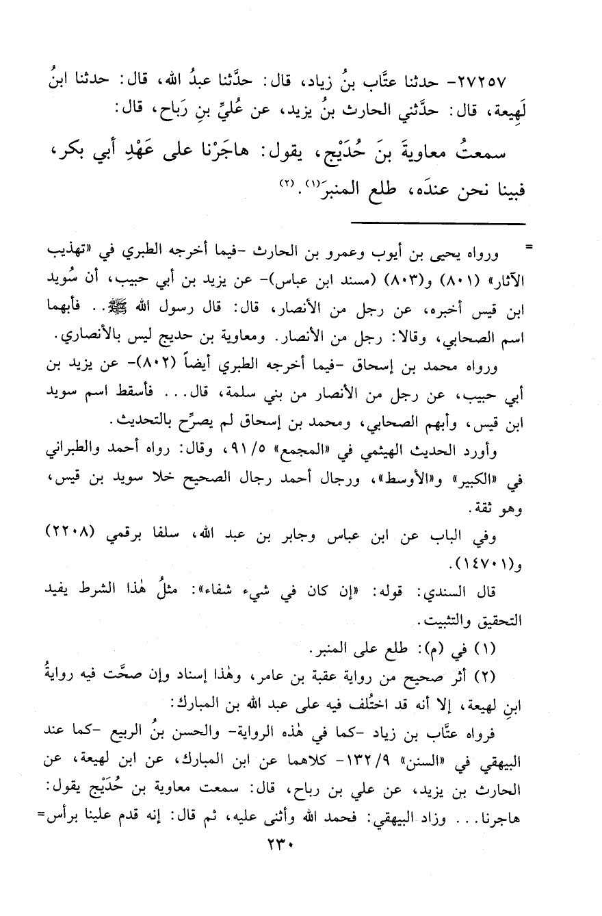 ٢٧٢٥٧ - حَدَّثَنَا عَتَّابُ بْنُ زِيَادٍ، قَالَ: حَدَّثَنَا عَبْدُ اللهِ، قَالَ: حَدَّثَنَا ابْنُ لَهِيعَةَ، قَالَ: حَدَّثَنِي الْحَارِثُ بْنُ يَزِيدَ، عَنْ عَلِيِّ بْنِ رَبَاحٍ قَالَ: سَمِعْتُ مُعَاوِيَةَ بْنَ حُدَيْجٍ يَقُولُ: " هَاجَرْنَا عَلَى عَهْدِ أَبِي بَكْرٍ فَبَيْنَا نَحْنُ عِنْدَهُ طَلَعَ عَلَى الْمِنْبَرِ (١) " (٢)