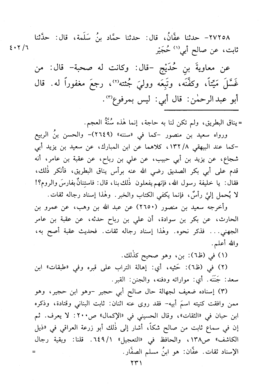 ٢٧٢٥٨ - حَدَّثَنَا عَفَّانُ، قَالَ: حَدَّثَنَا حَمَّادُ بْنُ سَلَمَةَ، قَالَ: حَدَّثَنَا ثَابِتٌ، عَنْ صَالِحٍ أَبِي (١) حُجَيْرٍ، عَنْ مُعَاوِيَةَ بْنِ حُدَيْجٍ قَالَ: وَكَانَتْ لَهُ صُحْبَةٌ قَالَ: " مَنْ غَسَّلَ مَيِّتًا وَكَفَّنَهُ وَتَبِعَهُ وَوَلِيَ جُثَّتَهُ (٢) رَجَعَ مَغْفُورًا لَهُ "، قَالَ أَبُو عَبْدِ الرَّحْمَنِ: قَالَ أَبِي: لَيْسَ بِمَرْفُوعٍ (٣)