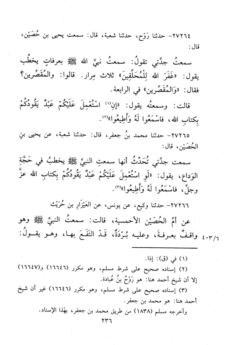 ٢٧٢٦٥ - حَدَّثَنَا مُحَمَّدُ بْنُ جَعْفَرٍ، قَالَ: حَدَّثَنَا شُعْبَةُ، عَنْ يَحْيَى بْنِ الْحُصَيْنِ قَالَ: سَمِعْتُ جَدَّتِي تُحَدِّثُ، أَنَّهَا سَمِعَتِ النَّبِيَّ صَلَّى اللهُ عَلَيْهِ وَسَلَّمَ يَخْطُبُ فِي حَجَّةِ الْوَدَاعِ يَقُولُ: " لَوْ اسْتُعْمِلَ عَلَيْكُمْ عَبْدٌ يَقُودُكُمْ بِكِتَابِ اللهِ عَزَّ وَجَلَّ فَاسْمَعُوا لَهُ وَأَطِيعُوا " (٣)