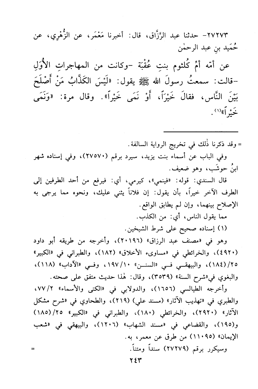٢٧٢٧٣ - حَدَّثَنَا عَبْدُ الرَّزَّاقِ، قَالَ: أَخْبَرَنَا مَعْمَرٌ، عَنْ الزُّهْرِيِّ، عَنْ حُمَيْدِ بْنِ عَبْدِ الرَّحْمَنِ، عَنْ أُمِّهِ أُمِّ كُلْثُومٍ بِنْتِ عُقْبَةَ ـ وَكَانَتْ مِنَ الْمُهَاجِرَاتِ الْأُوَلِ ـ قَالَتْ: سَمِعْتُ رَسُولَ اللهِ صَلَّى اللهُ عَلَيْهِ وَسَلَّمَ يَقُولُ: " لَيْسَ الْكَذَّابُ مَنْ أَصْلَحَ بَيْنَ النَّاسِ فَقَالَ خَيْرًا أَوْ نَمَى خَيْرًا "، وَقَالَ مَرَّةً: " وَنَمَى خَيْرًا " (١)